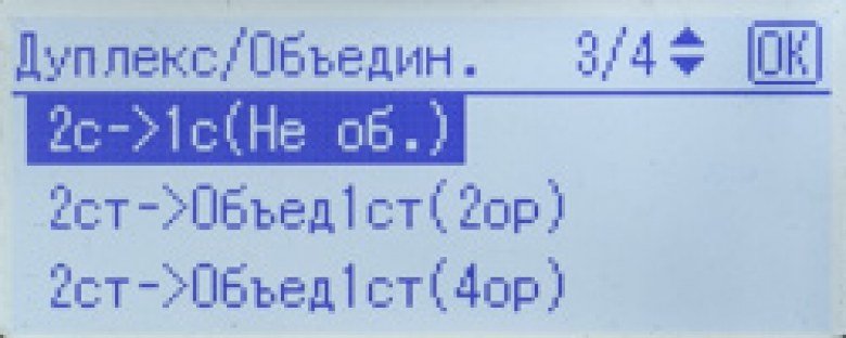 Задавать можно: количество копий (до 99, что даже при копировании пакета из нескольких оригиналов не сильно противоречит возможностям подающих и приемного лотков), масштаб (от 50 до 200 процентов — диапазон меньше, чем у многих других МФУ, но для большинства целей вполне достаточный), формат, тип оригинала, одно- и двусторонний режимы, объединение 2 или 4 страниц оригинала на одном листе копии с одной или двух сторон (некоторые варианты возможны только при работе с АПД, но не со стекла), плотность изображения.