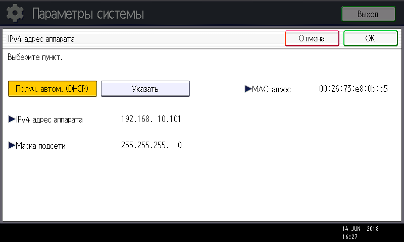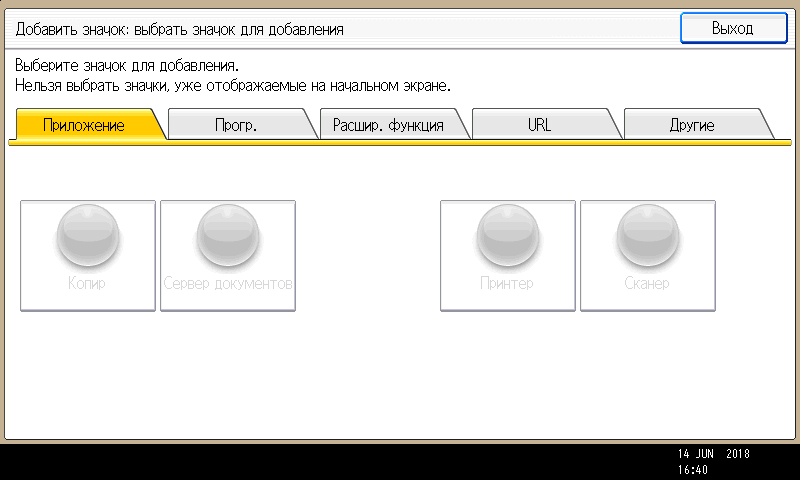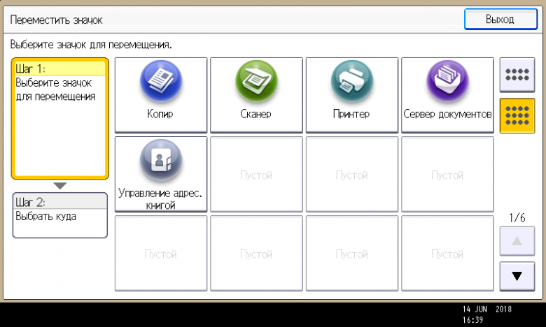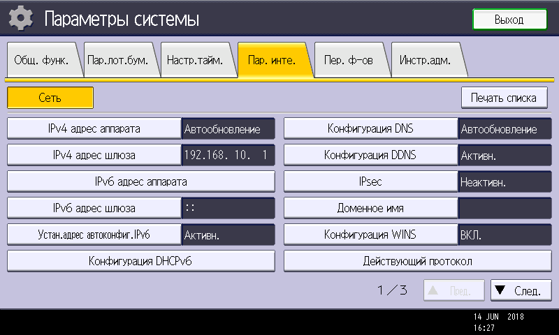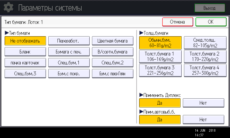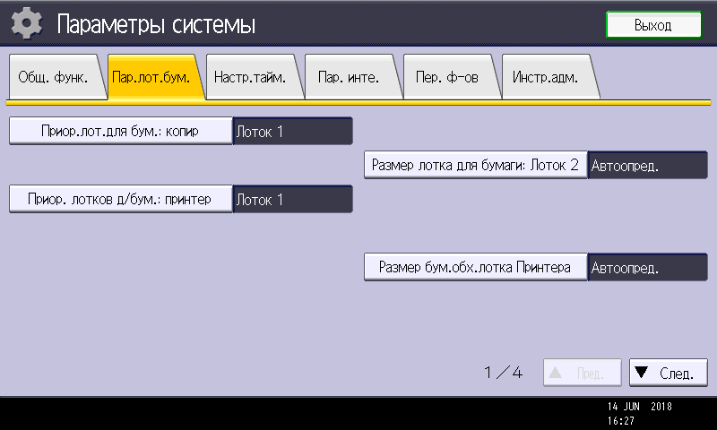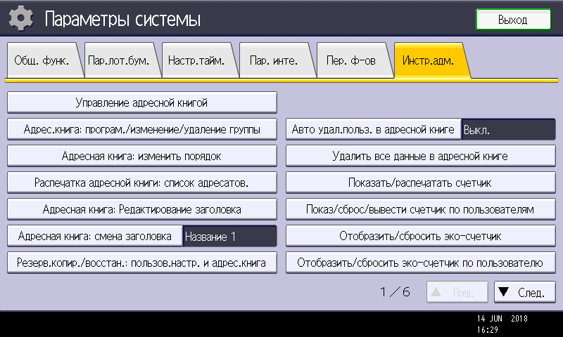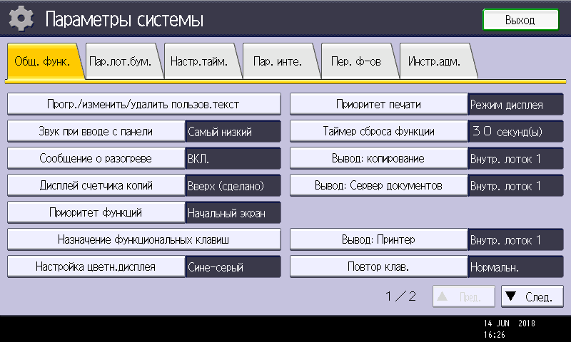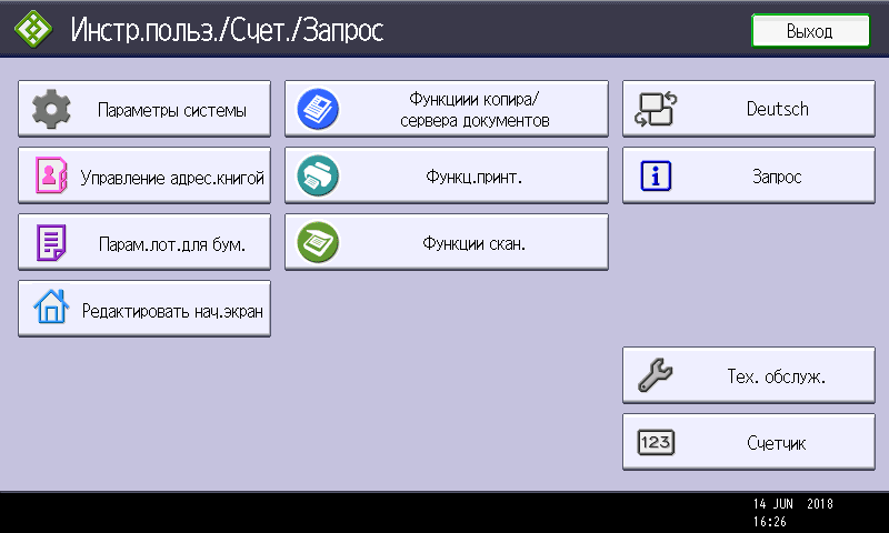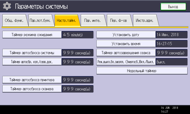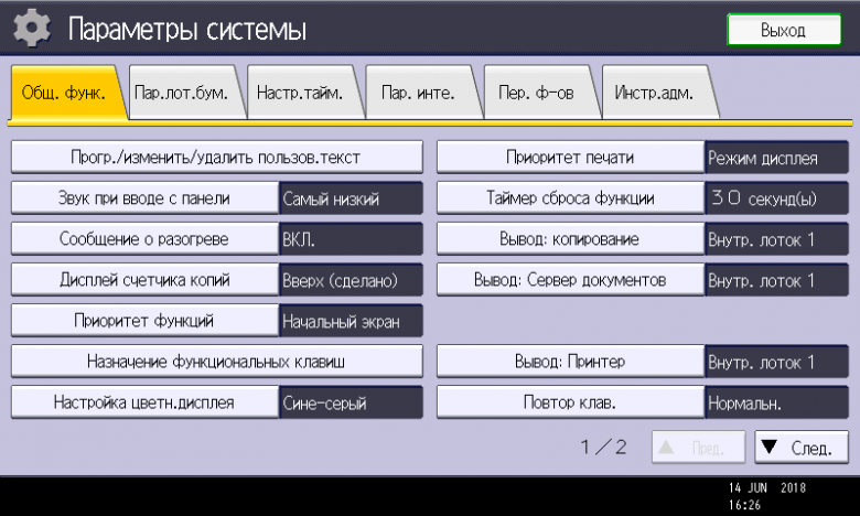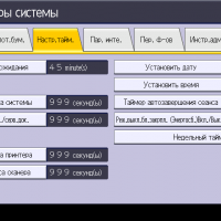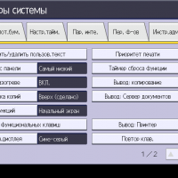 Заметим: вход в меню параметров системы производится нажатием кнопки (третьей в крайнем правом ряду), причем сделать это можно в любой момент, в том числе находясь на странице управления какой либо функцией — копированием или печатью. Соответственно и возврат после нажатия экранной кнопки «Выход» будет в то же место, откуда было вызвано это меню. Это очень удобно, если нужно оперативно поменять какие-то установки, которые не определяются на странице текущей операции.