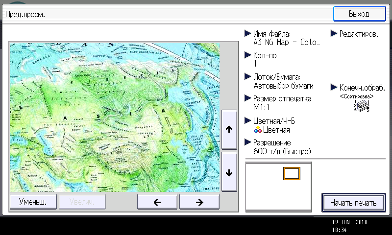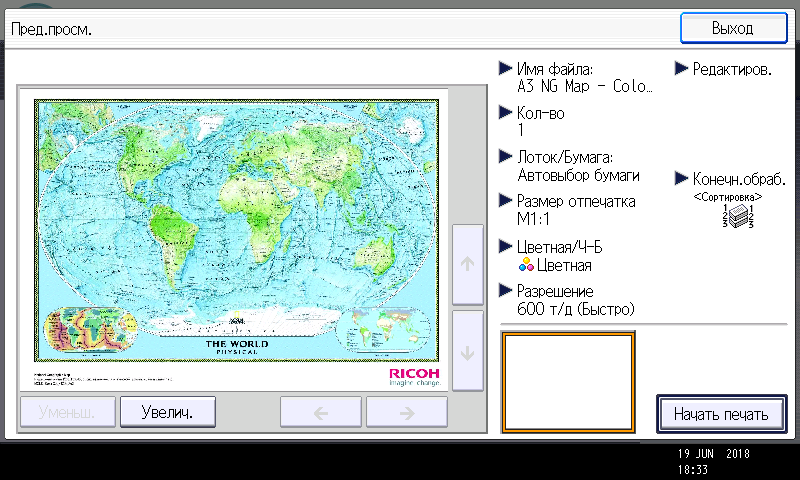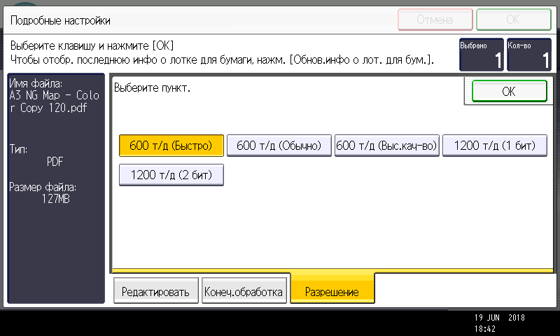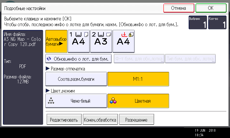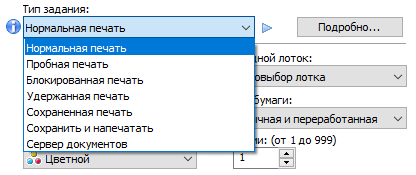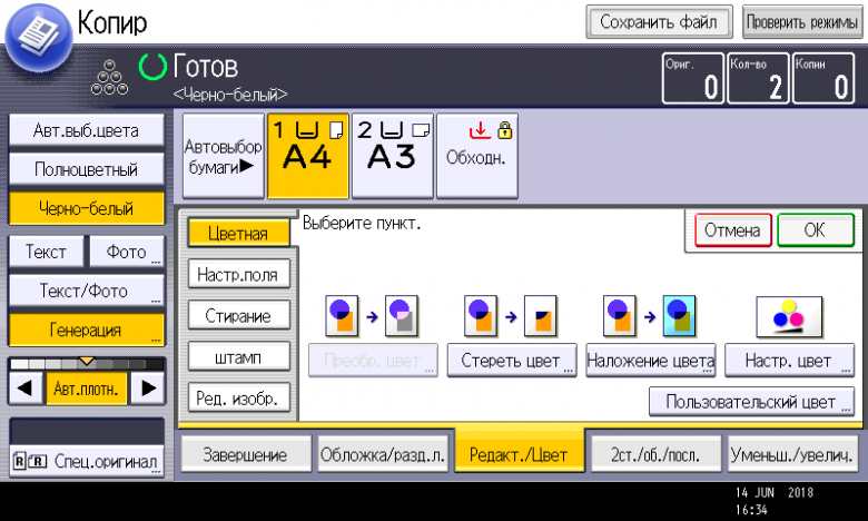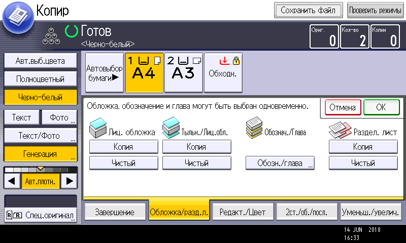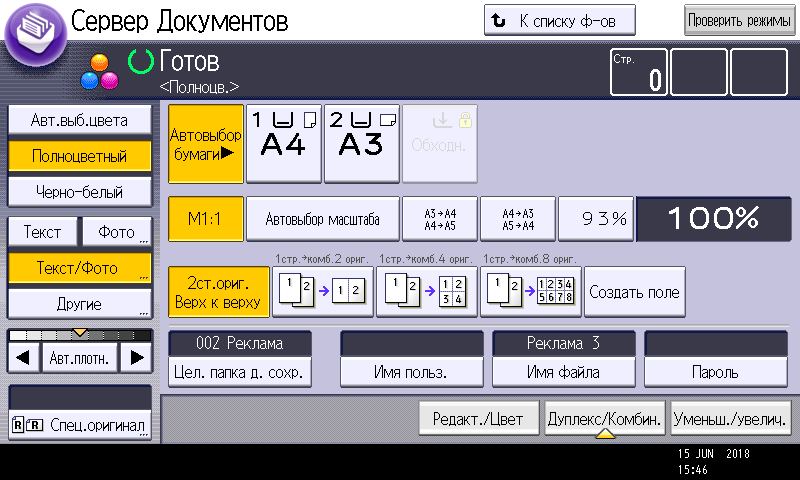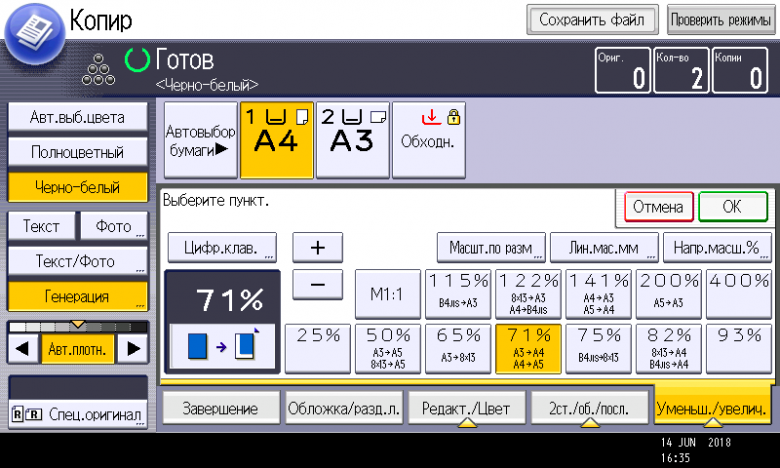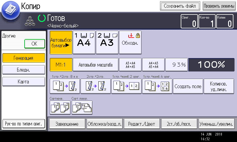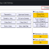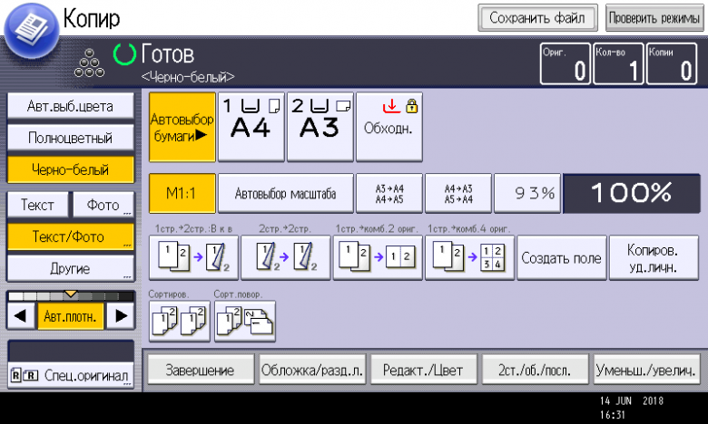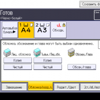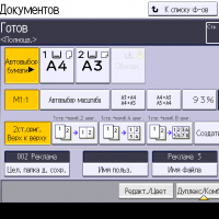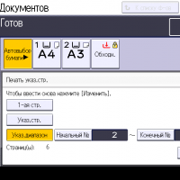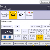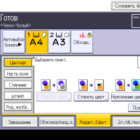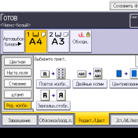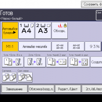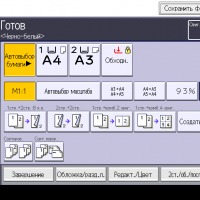 Оперативно выбираются: лоток (и соответственно носитель, на котором будет изготовлена копия), режим цветности и тип оригинала (их много, кроме привычных «текст — фото — текст/фото» есть и более специфические, вроде копирования карт или оригиналов с бледным изображением), а также плотность, масштаб, использование дуплекса, способ сортировки (в том числе поворотом), размещение нескольких оригиналов на одном листе копии с соответствующим уменьшением.