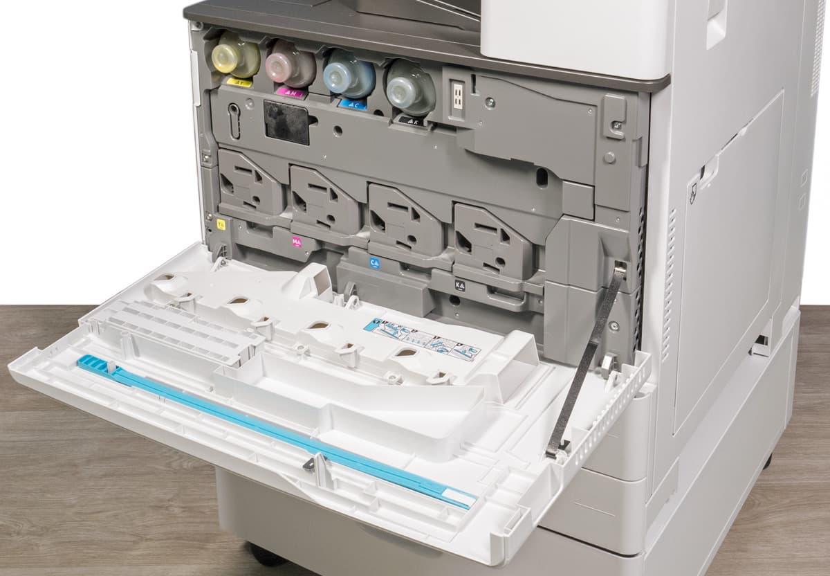 Всё прочее заменяется только специалистом сервисного центра: это и блоки девелопера Developer Unit на 120 тысяч отпечатков (для каждого цвета CMYK), и блоки фотобарабана Drum Unit с наработкой 60 тысяч для черного цвета и по 48 тысяч для CMY.