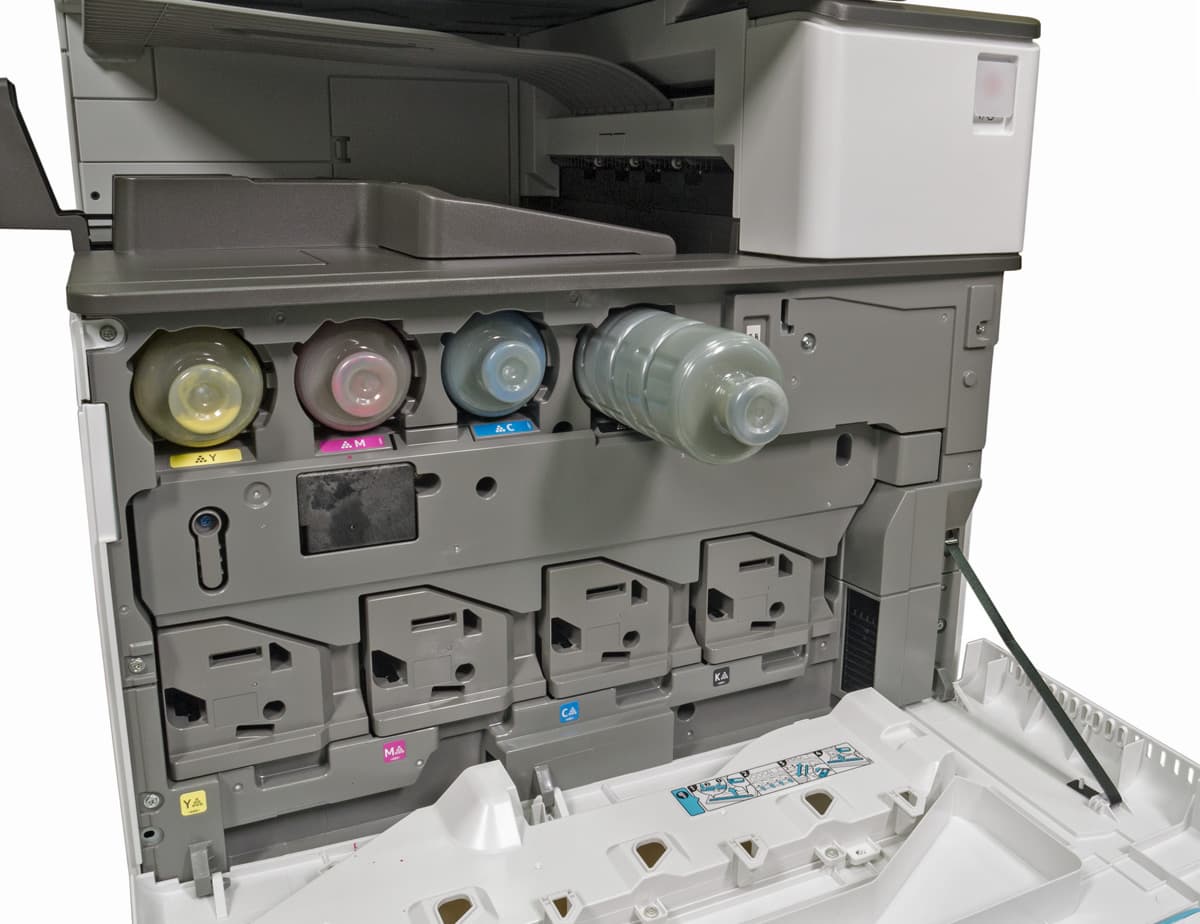 Прежде всего, это тонер-картриджи MP C2503 четырех цветов. Черный предлагается в единственном варианте, который обеспечивает до 15 000 отпечатков (формат А4 с заполнением 5%, по две страницы в задании; при подсчете в соответствии со стандартом ISO/IEC 19798 цифры будут отличаться). А вот цветные бывают стандартные на 5500 отпечатков для каждого цвета и повышенной емкости (к индексу добавляется буква H) на 9500 страниц. Эти картриджи совместимы и с некоторыми другими аппаратами Ricoh: MP C2003SP и другими.