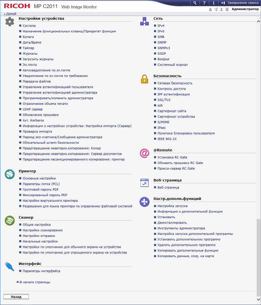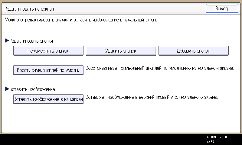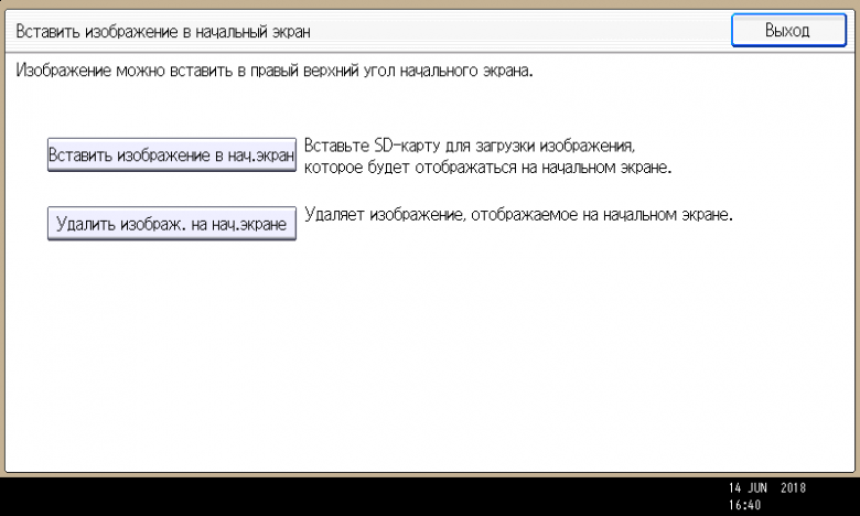 Начальную страницу можно украсить каким-нибудь изображением — например, логотипом собственной компании. А можно и вовсе заменить ее на страницу самой востребованной функции, и тогда МФУ после включения или автосброса по таймеру будет отображать страницу этой функции (копирования, сканирования и т. д.).