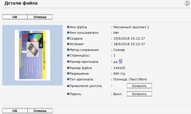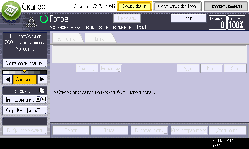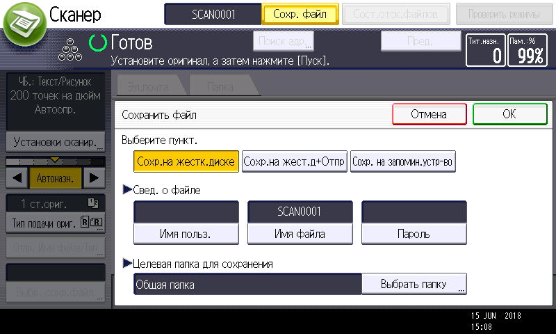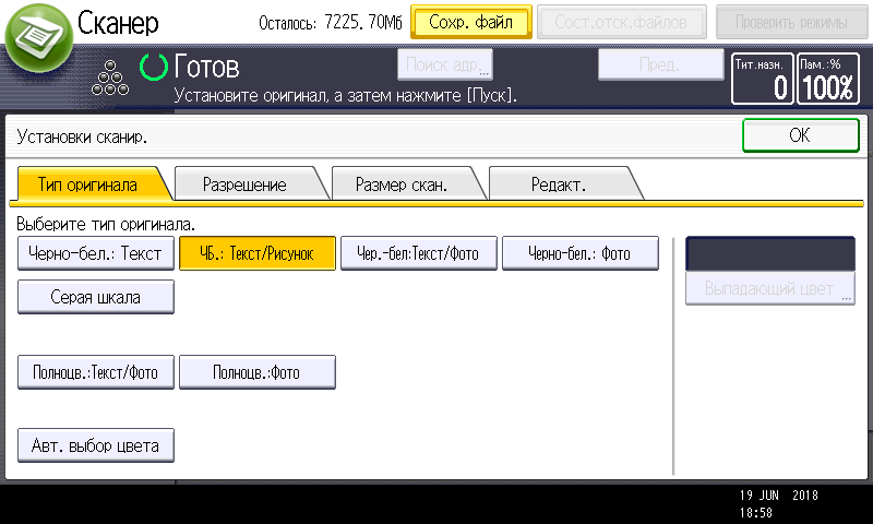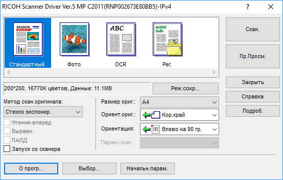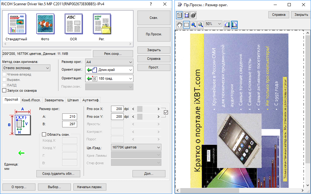 Для работы с USB-флешек задавалось сохранение в виде многостраничного PDF-файла, время замерялось от нажатия кнопки «Пуск» до появления сообщения об окончании записи файла, при сканировании с компьютера — от старта кнопкой приложения до появления последней страницы в его окне. Поскольку установки «Тип оригинала», как на панели управления МФУ, в драйвере нет, использовались наиболее близкие параметры, они указаны в скобках.
