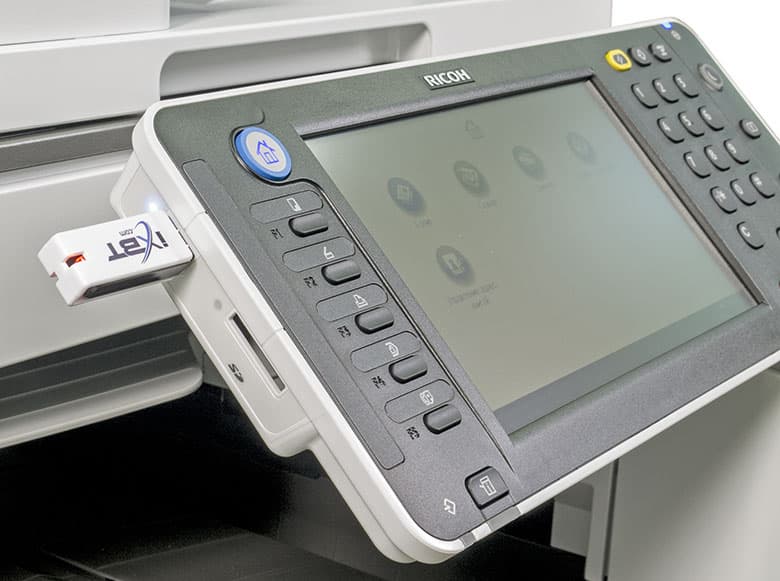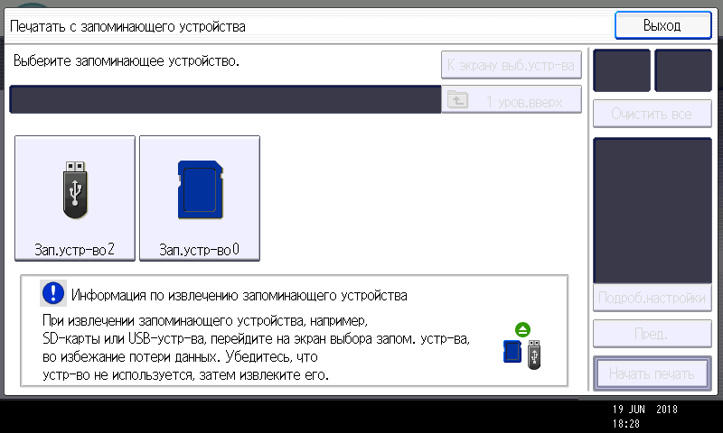 Можно одновременно вставлять оба типа накопителей, нужный можно будет выбрать при задании соответствующей функции (печать, сканирование). Не очень логично, что этап выбора внешнего носителя появляется и в случае, когда он единственный.