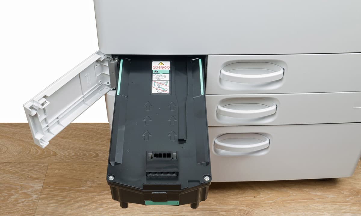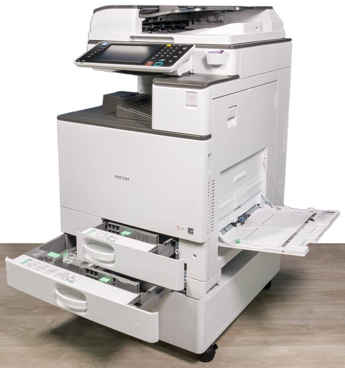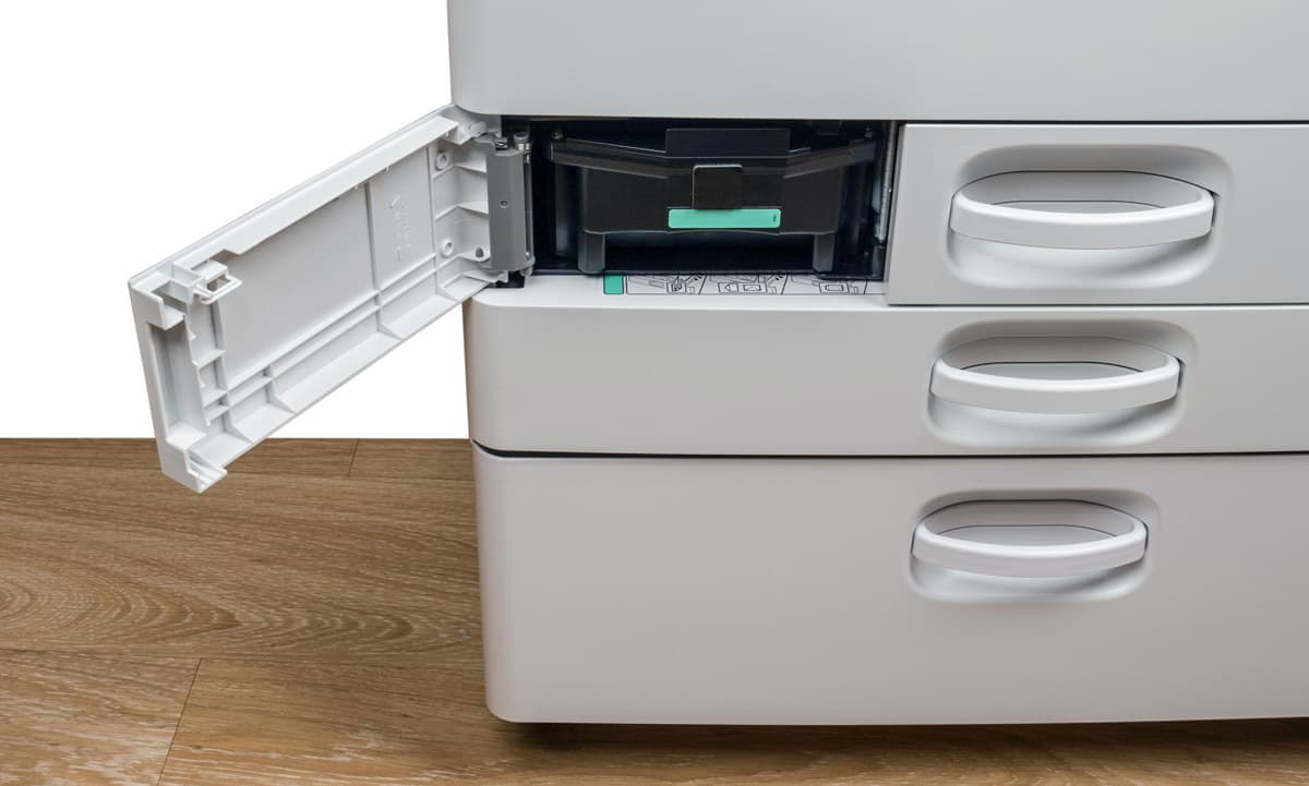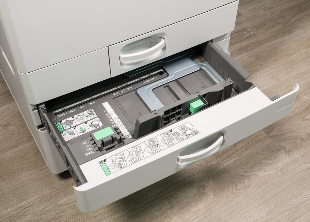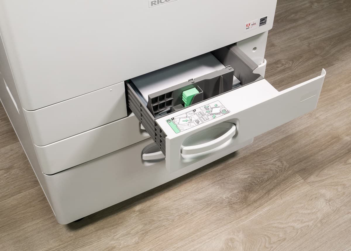 Штатных подающих лотков три. Два выдвижных находятся в нижней части базового блока, они вмещают по 550 листов. Таким образом, в каждый из них можно положить полную пачку бумаги, даже если ее плотность несколько выше обычных 80 г/м². Отличаются лотки предельным форматом: первый (верхний) до А4, второй (нижний) до А3/SRA3.