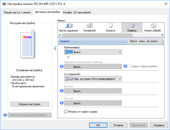 Глубокое «погружение в недра» меню позволит осуществлять и более специфические настройки: вставку обложек и разделительных листов, точную настройку цветопередачи, задание полей, внедрение штампа (нумерация, дата, надпись и т. п.) и даже некоторые функции редактирования — от многократного повтора небольшого изображения на всей площади листа до зеркального отображения или преобразования в негатив. Естественно, кое-что из перечисленного потребует соответствующей подготовки: так, бумага (скажем, цветная) для разделительных листов должна быть уложена в один из лотков.