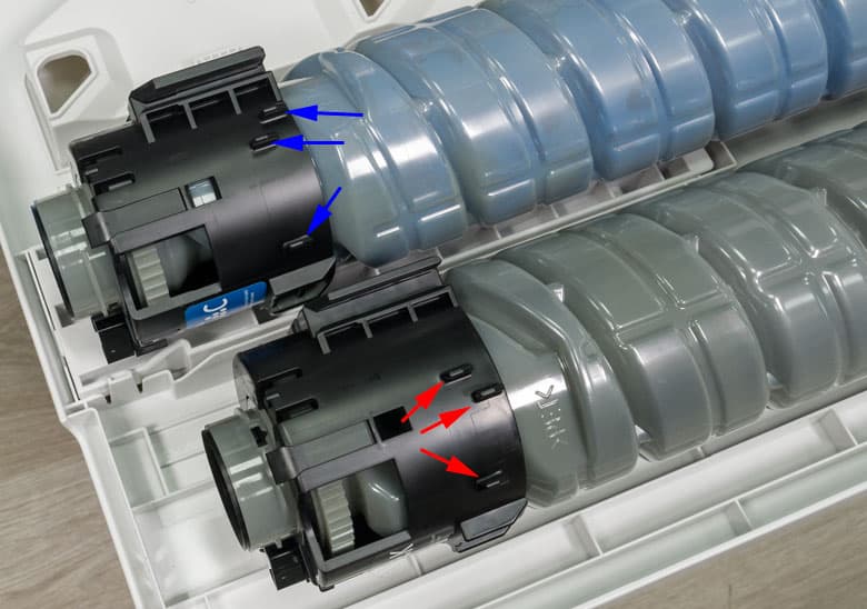 У картриджей есть ключи — выступы в головной части, которые не дадут установить, например, голубой тонер в отсек, предназначенный для желтого или черного.