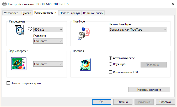 Но надо сказать, что побывавшие у нас образцы полноцветных печатающих устройств Ricoh отличались и отличаются в этом плане в лучшую сторону. Главную претензию мы озвучили чуть выше: очень трудно получить отпечаток, максимально приближенный к оригиналу по передаче оттенков цвета, включая черный и градации серого, но это общая беда всех подобных принтеров.