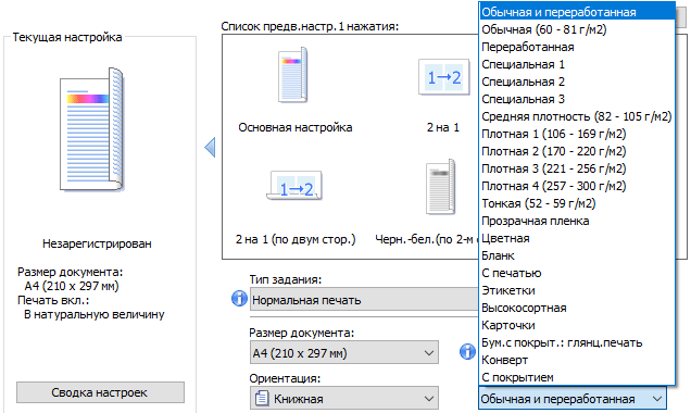 Конверты: инструкция требует загружать их в любой из лотков, кроме первого (верхнего); соответственно и в драйвере для этого лотка нельзя выбрать «Тип бумаги — конверт». И, конечно, нужно задать соответствующий тип и размер носителя в настройках. У нас нашлись конверты размером 227×157 мм, мы задавали ближайший — С5, 229×162 мм (задается не в пункте «Бумага» меню второй закладки драйвера, а в пункте «Основной — Размер документа»), дважды по десять таких конвертов через МФУ прошли нормально с подачей длинной стороной из второго лотка.