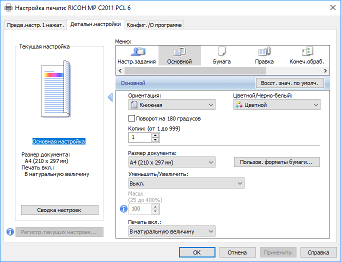Поскольку набор настроек очень велик, разработчики дали возможность оперативно посмотреть текущие установки: нажатие находящейся в правом верхнем углу экрана кнопки «Проверить режимы» отобразит страницу с расширенным набором выбранных настроек копирования.