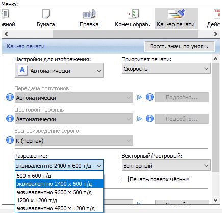 Если печатать с разрешением 600 dpi, то всё вышесказанное получается пусть и немного, но хуже, и это видно даже без лупы. А вот при повышении разрешения сверх физического (в драйвере PCL 6 такие установки есть) сколь-нибудь заметную разницу сложно найти даже при увеличении, то же касается и смены приоритета «Скорость — Нормальный — Качество».