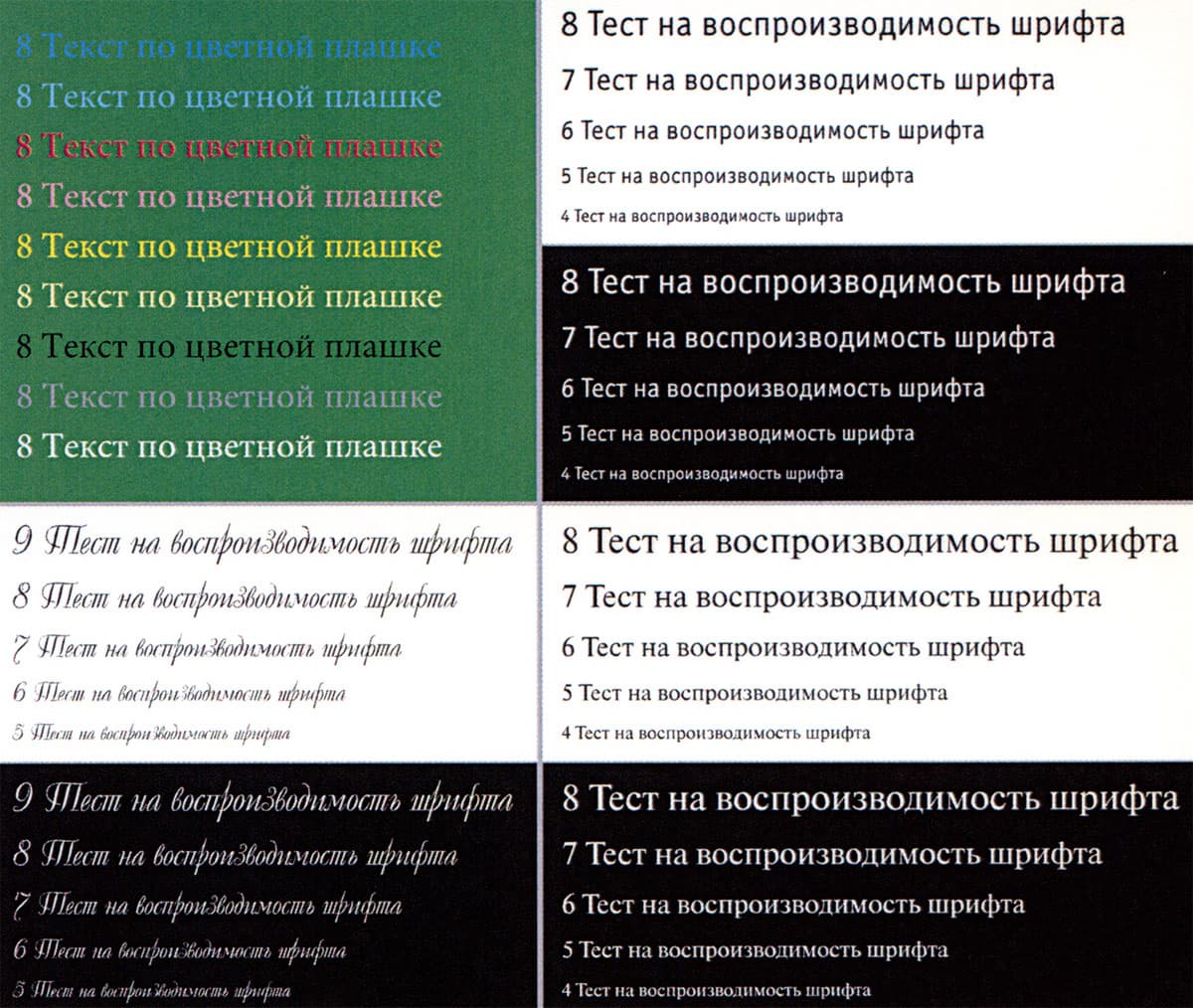 На текстовых полях при печати нормальной и вывороткой шрифты с засечками и без читаются от 4-го кегля, декоративный шрифт реально читается с кеглем от 5-го нормальный и от 6-го вывороткой. И даже цветной текст на зеленой плашке выглядит неплохо, исключая разве что синий шрифт.
