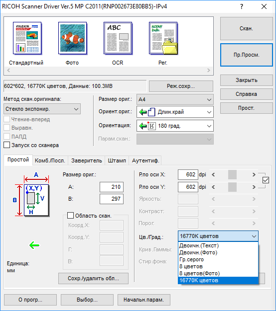 | Режим | Установки (в скобках для TWAIN) | USB-флешка | LAN (1 Гбит/с) | ||