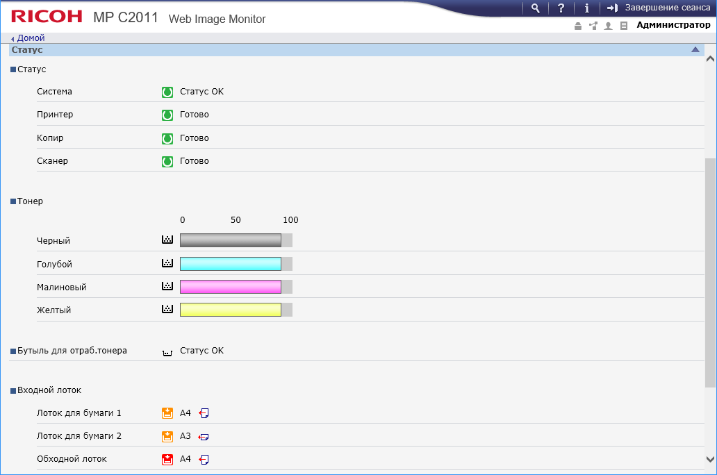 | Стандартные лотки, вместимость при 80 г/м² | Подающие: выдвижные 2×550 листов, обходной 100 листов Приемный: 500 листов |