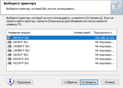 На следующем этапе подтверждаем, что устанавливается новый принтер (но можно обновить и уже установленный), и выбираем нужный: