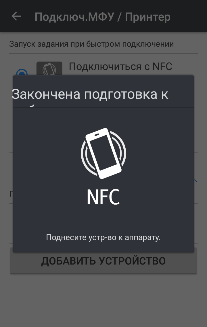 На этот раз мы попробовали использовать NFC, после размещения тестового смартфона надо меткой принтер был благополучно обнаружен.