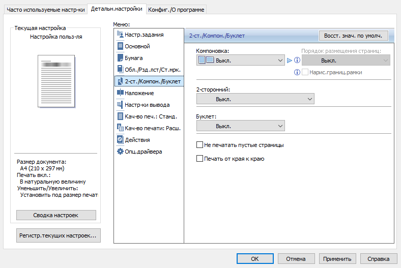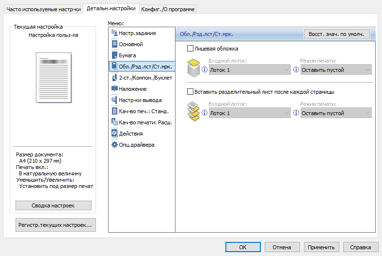 Третья закладка посвящена настройке не печати, а первых двух закладок — например, можно определить, какая их них будет открываться при вызове настроек, что очень удобно, например, при необходимости часто менять какие-то конкретные установки.