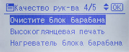 Предусмотрена процедура, называемая «восстановление барабана» — ее запускают в случаях, когда на отпечатках появляются полосы или белые точки. Можно задействовать и автоматическое выполнение процедуры через определенный срок, причем в трех вариантах: коротком, стандартном и длительном. Хотя оба способа восстановления барабана доступны в меню, инструкция почему-то рекомендует перед их запуском обращаться в сервисный центр.