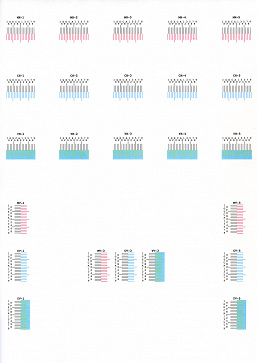 В обычном режиме сначала распечатывается диаграмма коррекции с наборами линий разных цветов, расположенных в двух направлениях. В каждом наборе должны точно совпадать линии, помеченные символом нуля, если в каком-то из 9 наборов этого нет — корректируем, вводя с помощью панели управления значения меток, на которых линии совпадают.