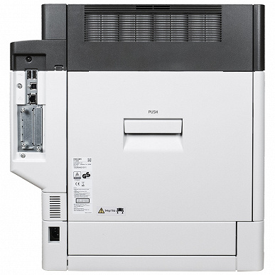 За выступом на правой стенке скрывается плата с электронной «начинкой» принтера. Прямого доступа к ней нет, но он пользователю и не нужен — различные опции (включая адаптер Wi-Fi и жесткий диск) устанавливаются в специальные отсеки, крышки или заглушки которых легко можно снять снаружи.