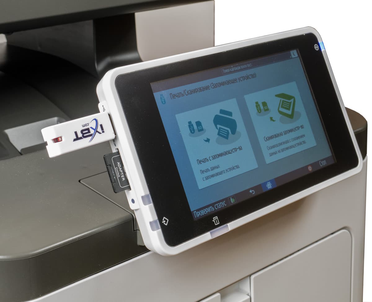 Как сказано выше, МФУ «умеет» работать с накопителями USB-flash и SD-картами. Но, конечно, не с любыми — есть ограничения: емкость не должна превышать 32 ГБ, в отношении файловой системы инструкция говорит о FAT16 и FAT32. Поддерживаются карты SD и SDHC, но не SDXC; не предусмотрена работа с внешними USB-концентраторами и картоводами, а также использование USB-удлинителей.