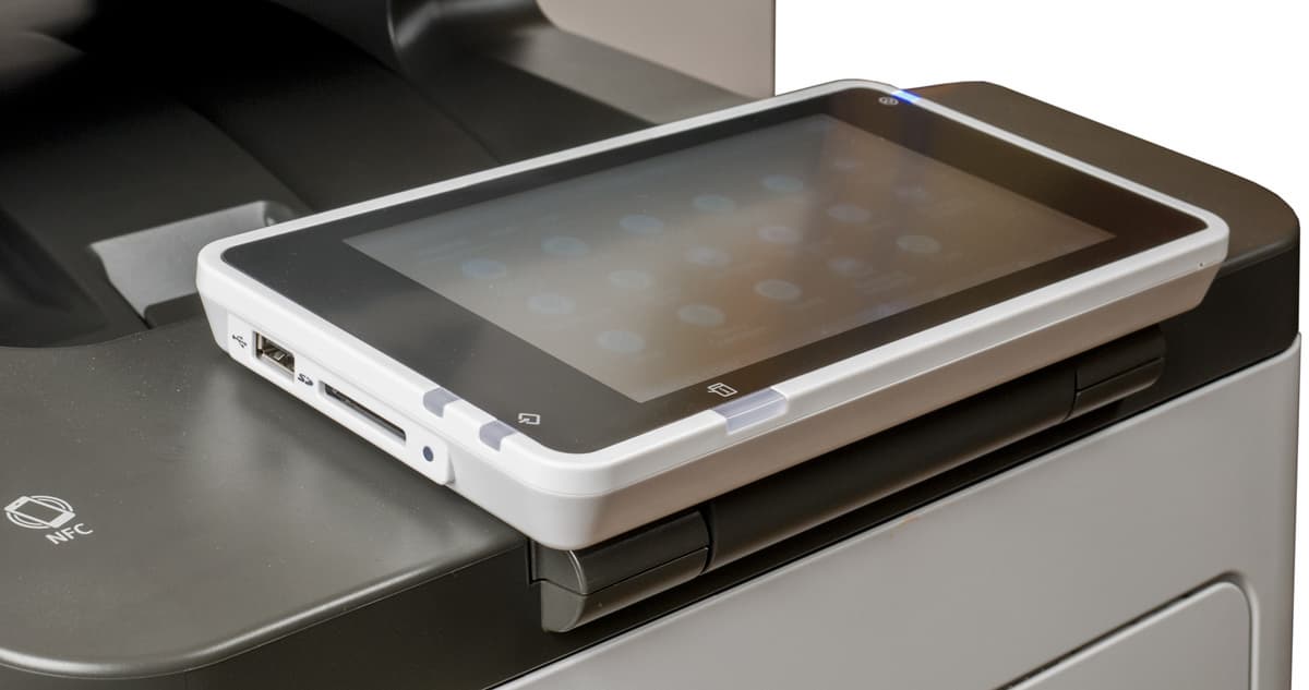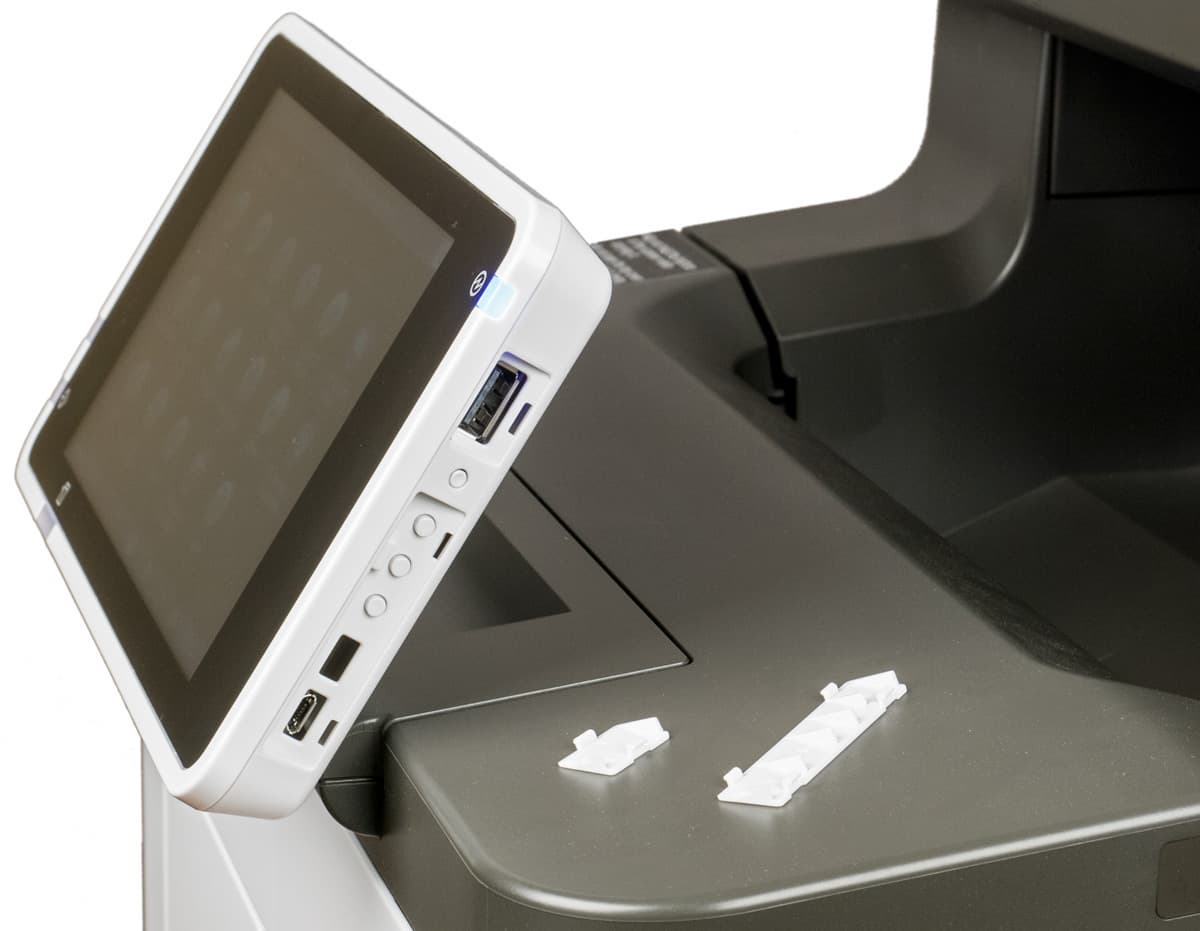 Над передней частью печатающего блока находится панель управления, имеющая две важных особенности. Первая — цветной сенсорный ЖК-экран большого для МФУ такого класса размера: его диагональ составляет 7 дюймов (почти 18 см). Вторая — способ крепления: передняя кромка панели соединяется с корпусом МФУ шарниром, позволяющим менять положение экрана от почти горизонтального до вертикального. Усилие поворота немалое, что позволяет не беспокоиться за положение панели при касаниях к сенсорному экрану.