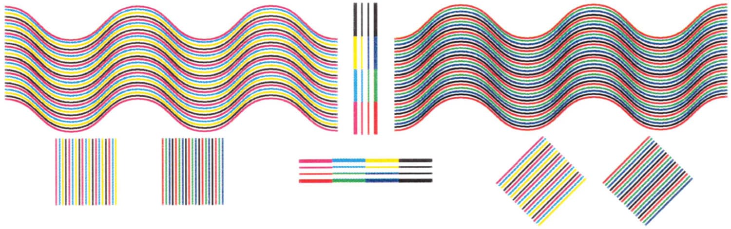 Совмещение красок по вертикали близко к идеальному даже без всяких предварительных калибровок, по горизонтали немного хуже. Тонкие линии воспроизводятся хорошо, без заметных невооруженным глазом разрывов и ступенек. На тонких изогнутых линиях нет перетеканий и ступенчатой структуры.