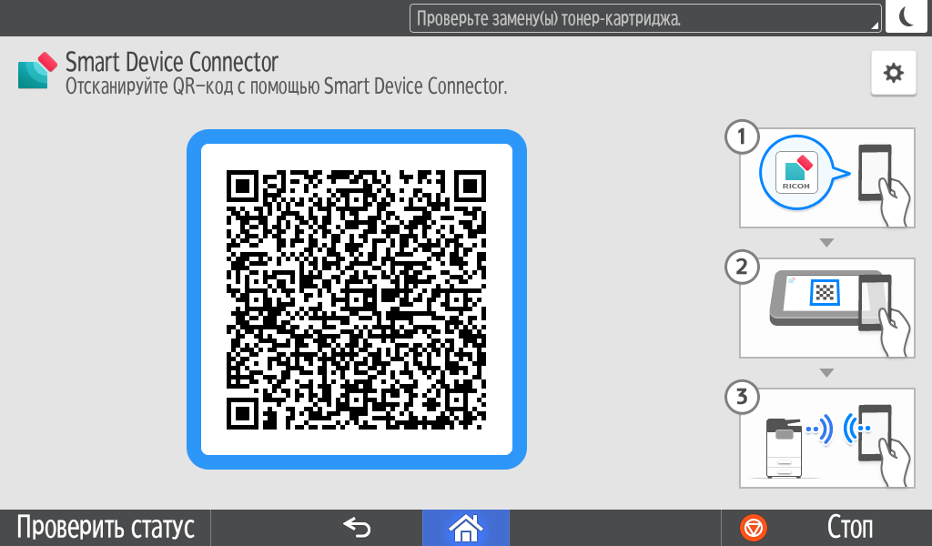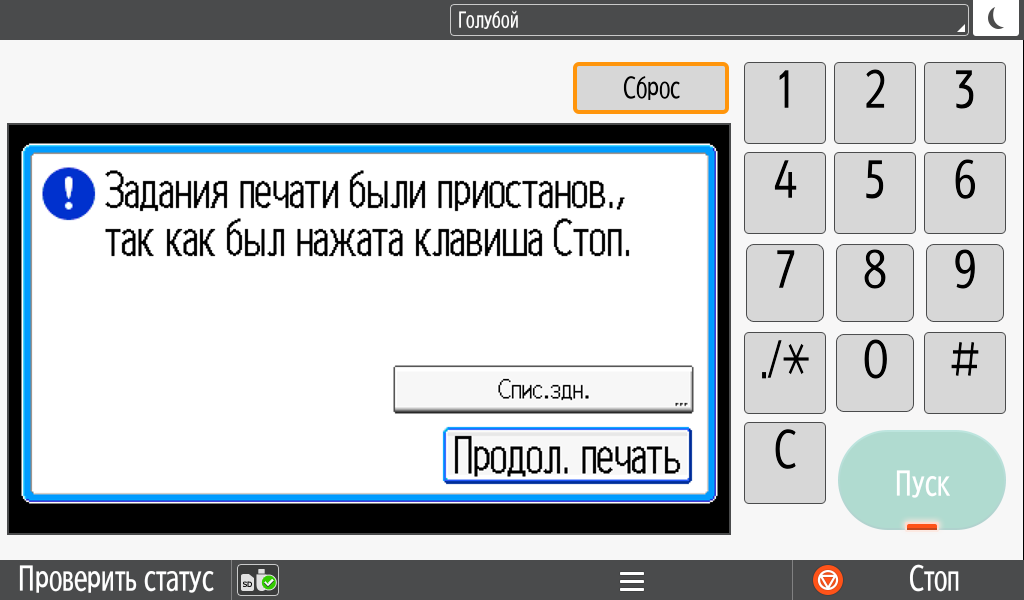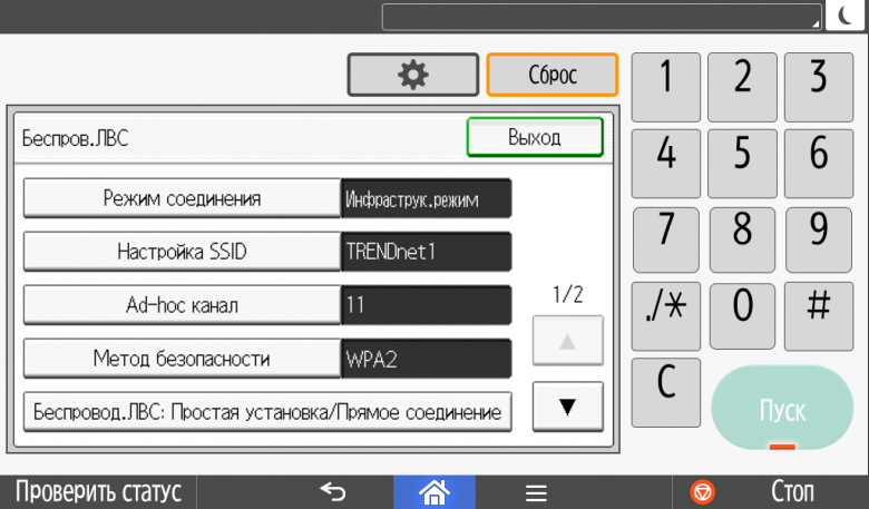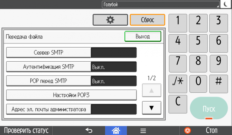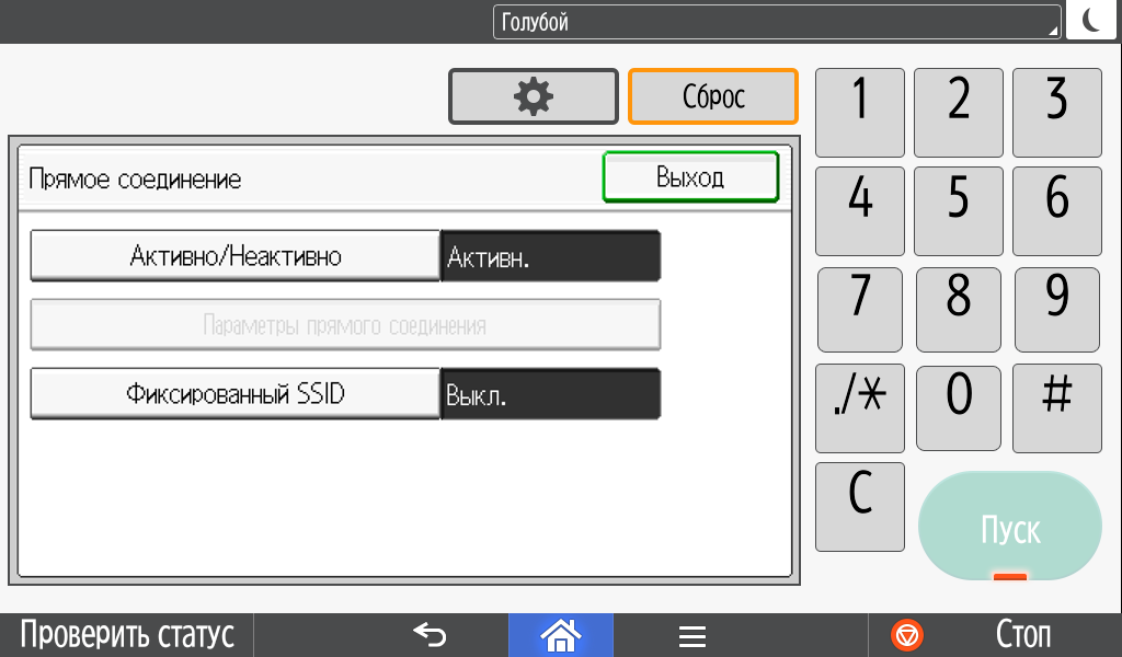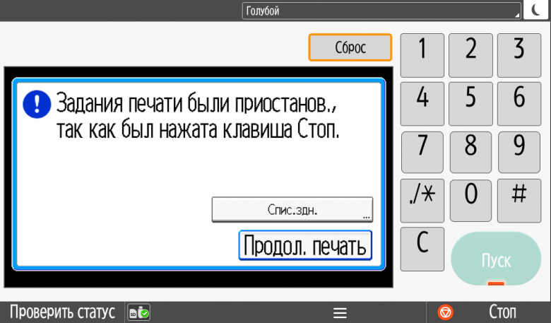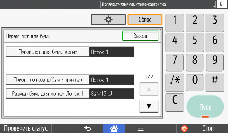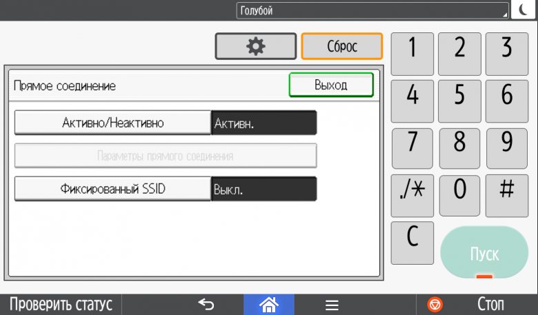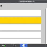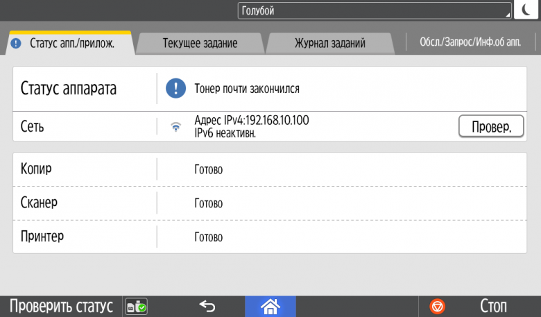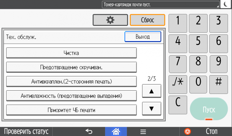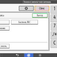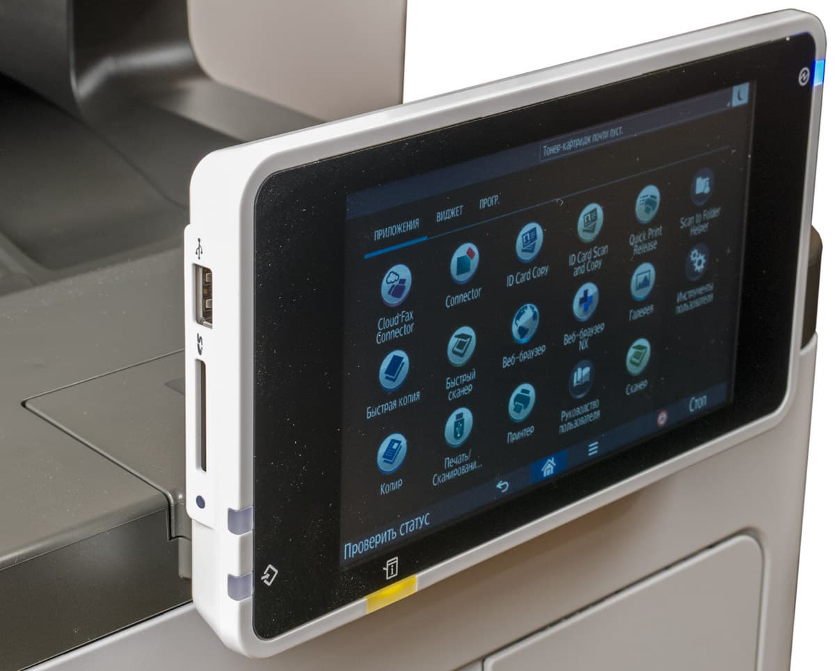 Каких-либо кнопок на панели нет вообще, всё взаимодействие осуществляется через сенсорный экран. Дополнительных индикаторов тоже немного: справа вверху — питания (синий, в режиме сна он медленно мигает), слева внизу — состояния (горит красным при возникновении ошибок и мигает желтым для предупреждений, например, о малом остатке тонера) и ввода данных (мигает в процессе получения заданий). Для моделей, имеющих модуль факса, над индикатором ввода данных есть еще один светодиод, отображающий состояния для этой функции.