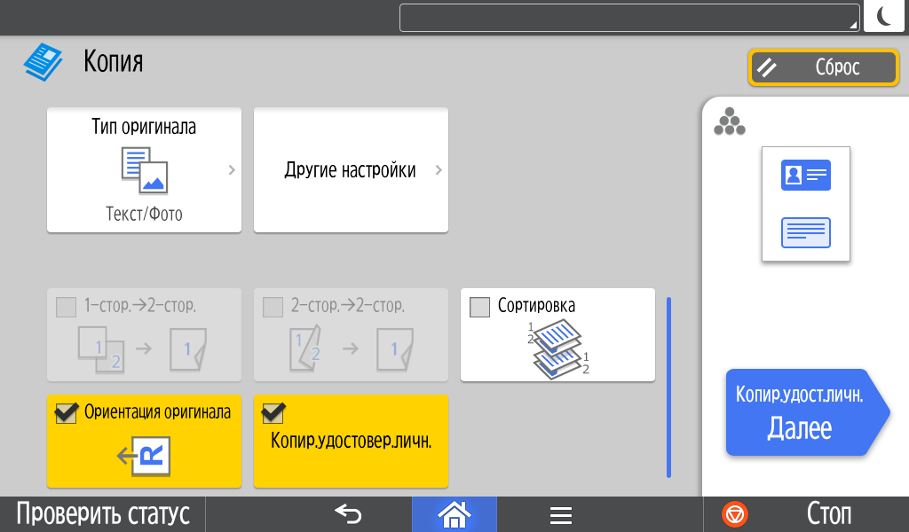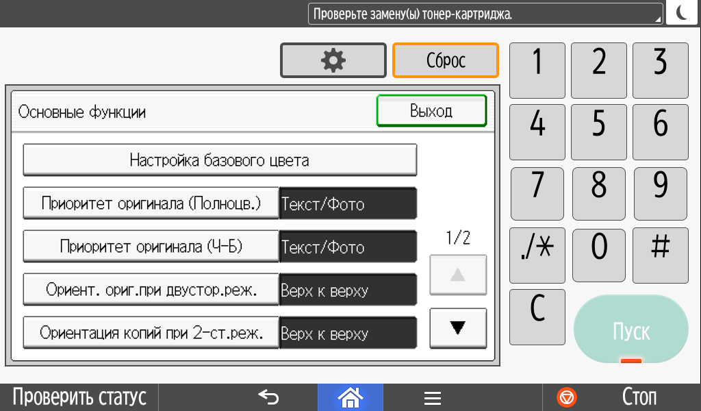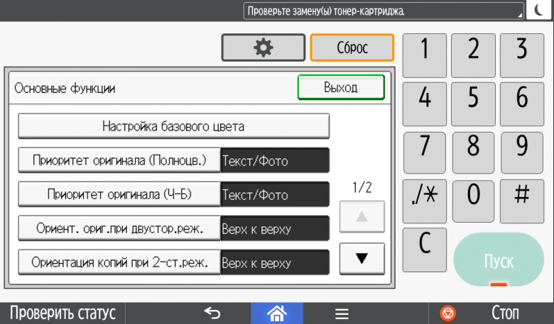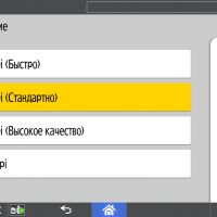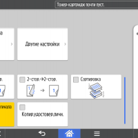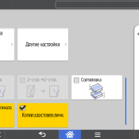 Набор задаваемых параметров вполне обычный, он включает два режима цветности, одно- или двустороннее копирование (в том числе односторонние оригиналы в двусторонние копии и наоборот), выбор формата бумаги и лотка, масштабирование (включая объединение двух страниц оригиналов на одной копии), регулировку плотности изображения, тип оригинала (текст, фото, смешанный, а также оригиналы с темным фоном — для него обещают осветление), сортировку для тиражей многостраничных документов.