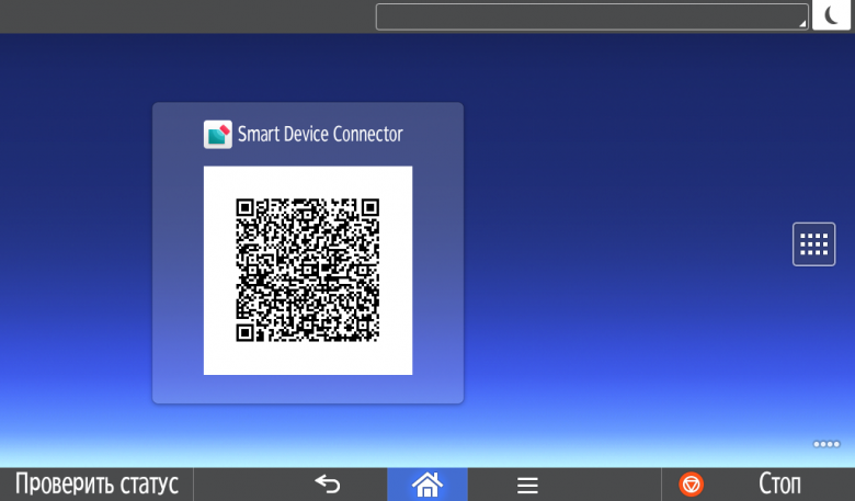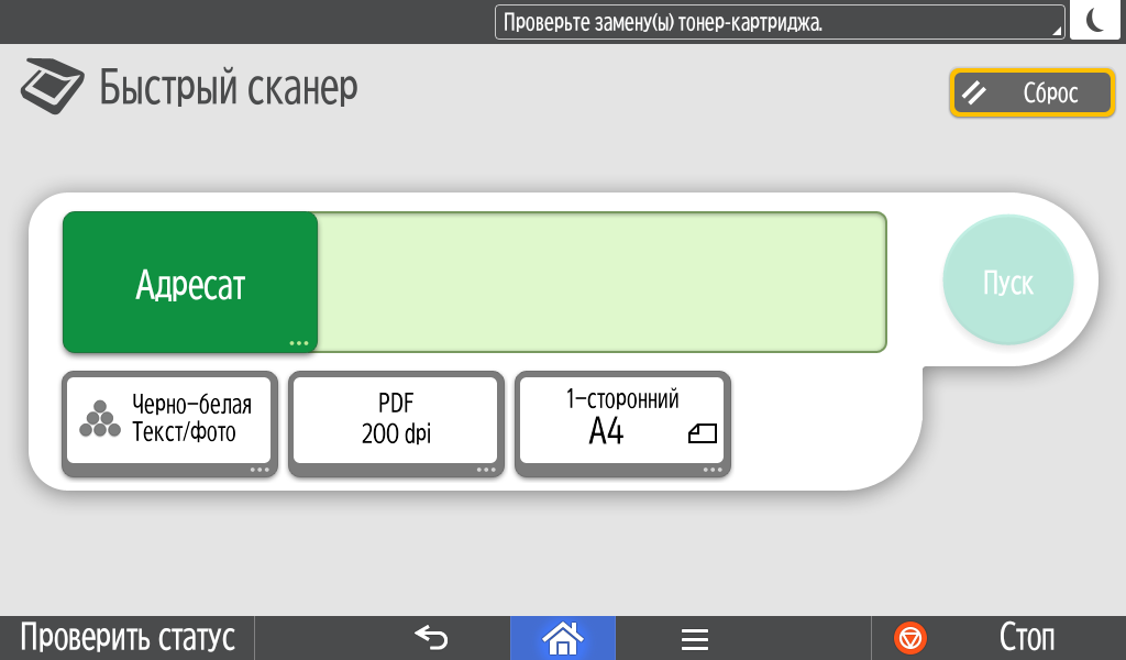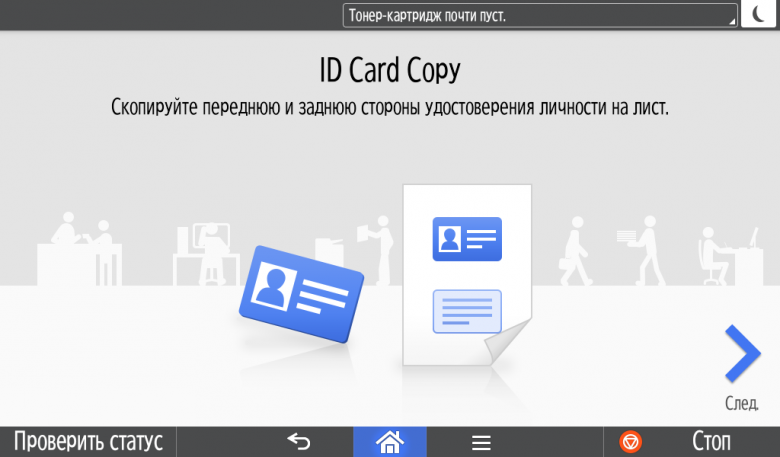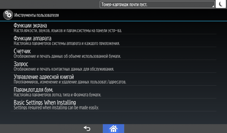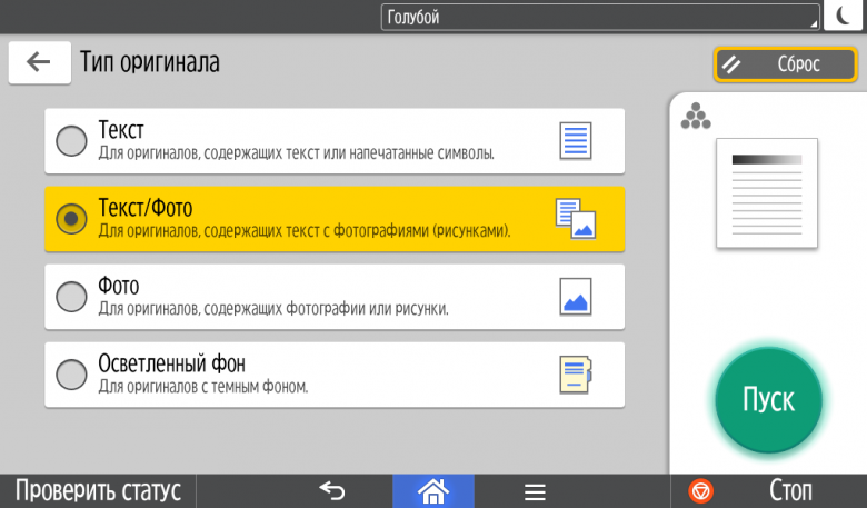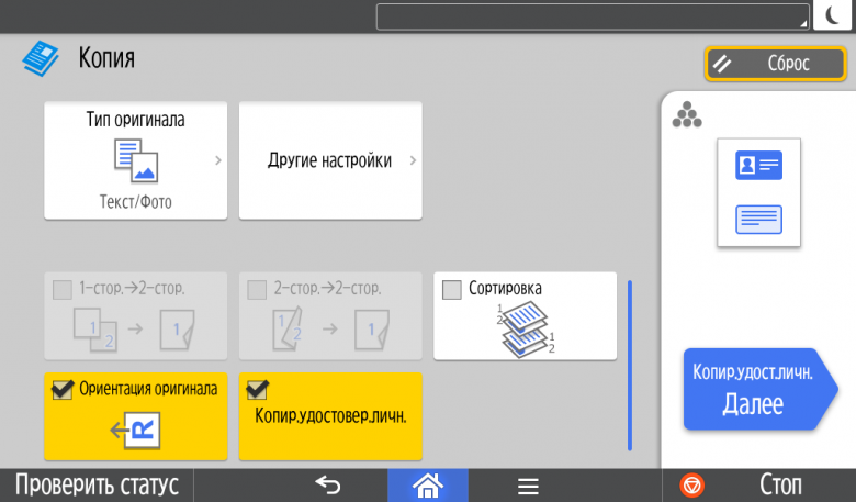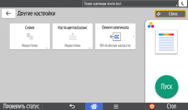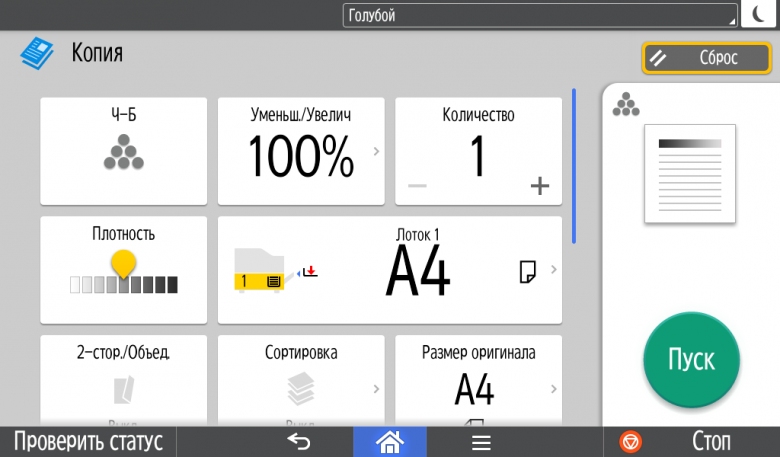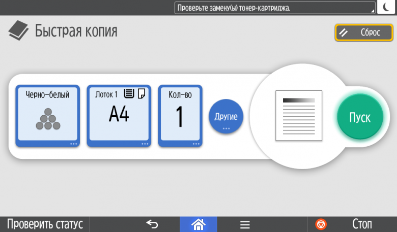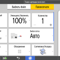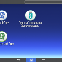 Для каждой из основных функций имеется соответствующий инструментарий: выбор параметров в виде крупных прямоугольных иконок, а также тот или иной набор управляющих кнопок. Кроме этого, в графическом виде отображаются и некоторые установки (например, цветной или монохромный режим копирования).