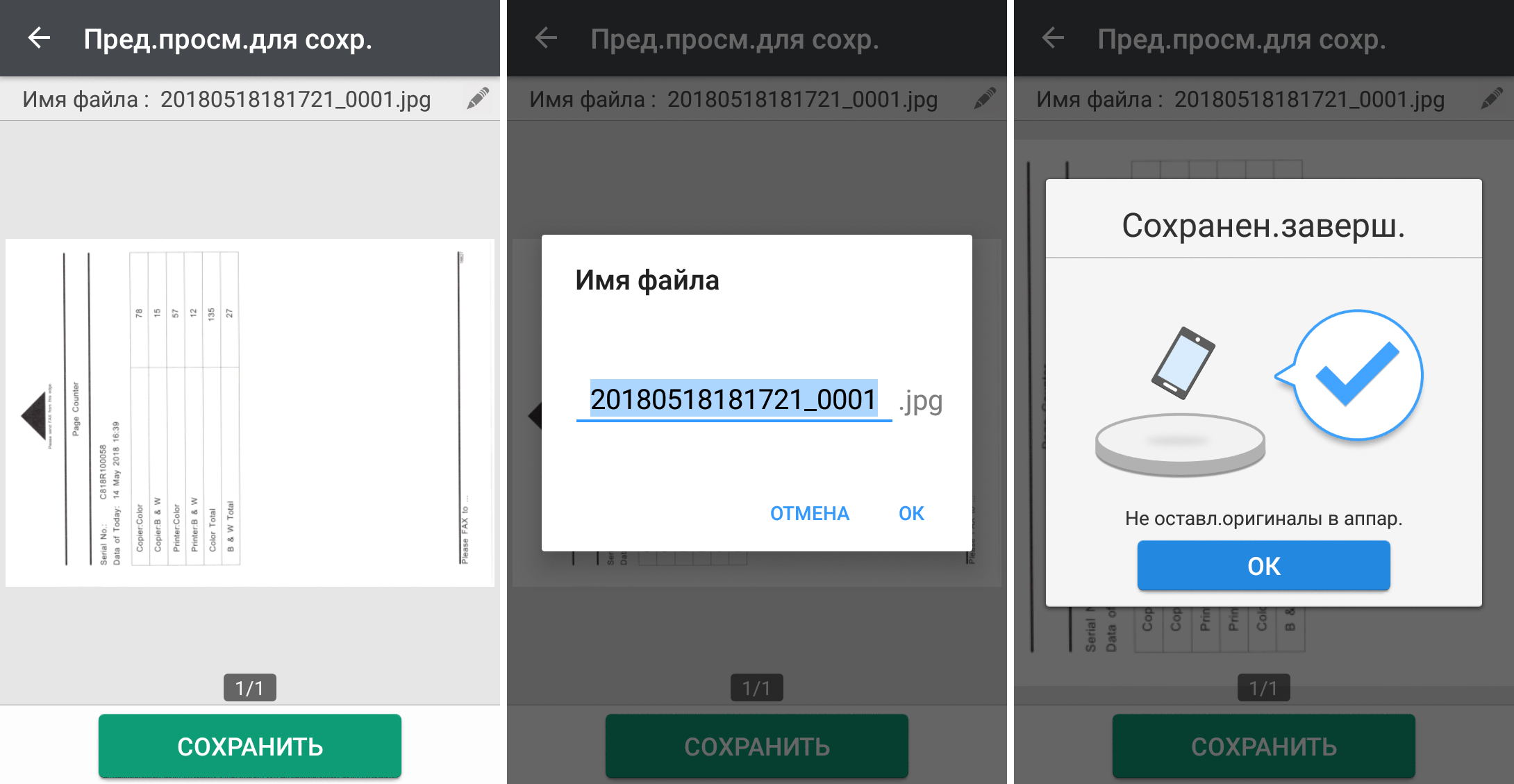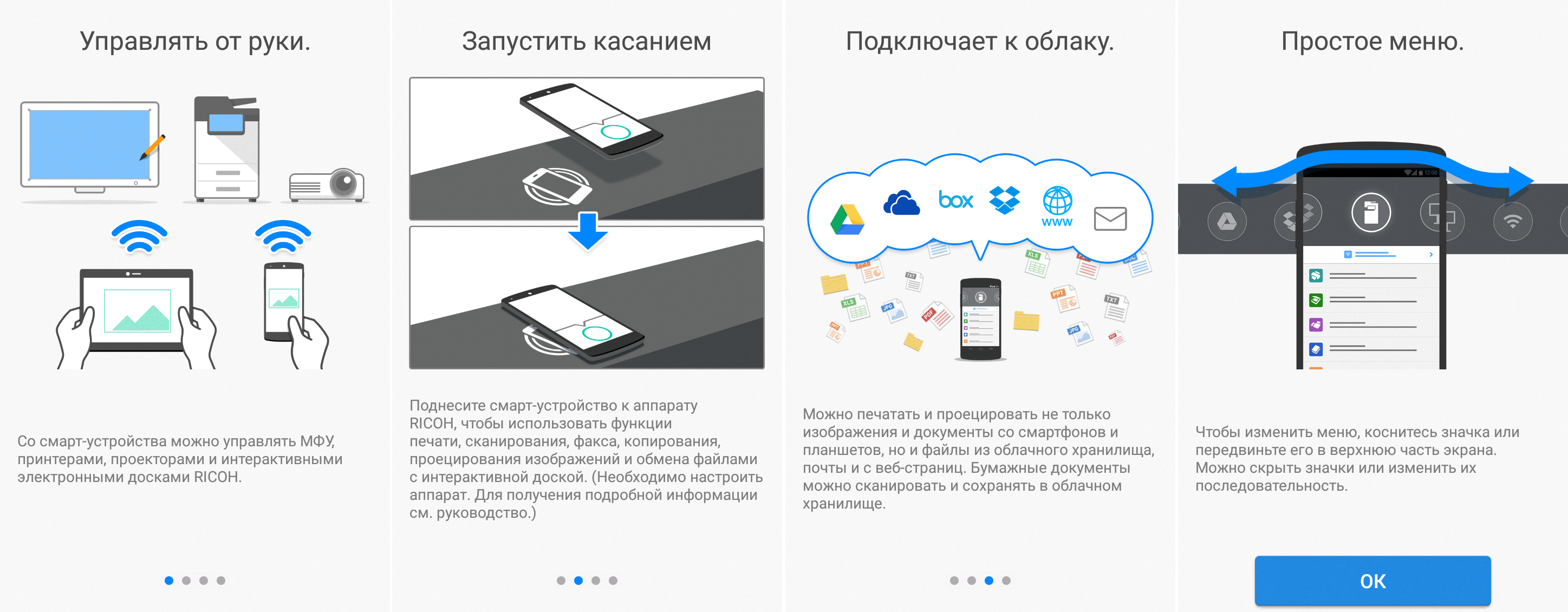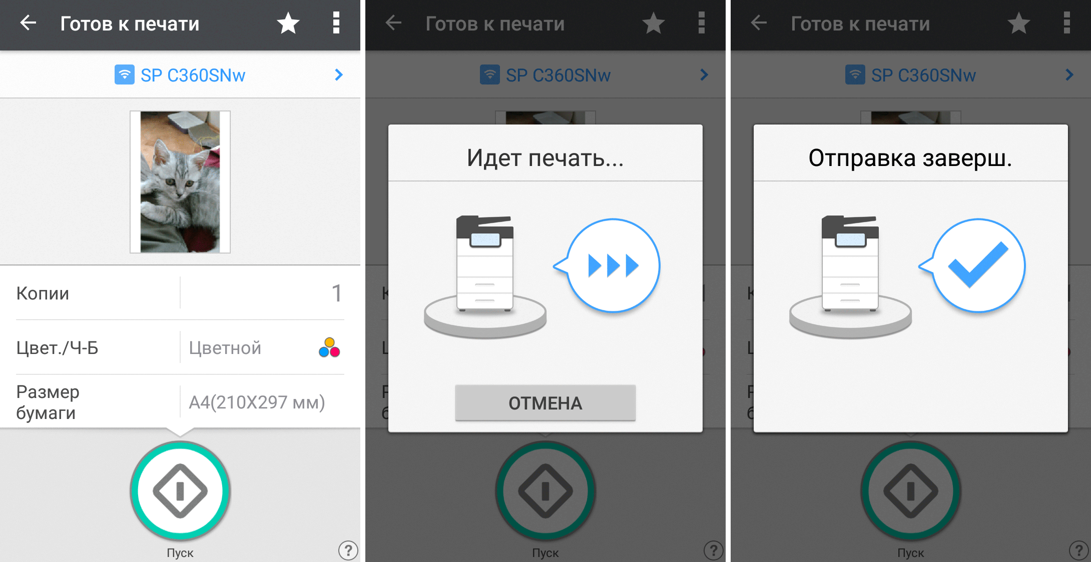 Для каждой из основных функций имеется соответствующий инструментарий: выбор параметров в виде крупных прямоугольных иконок, а также тот или иной набор управляющих кнопок. Кроме этого, в графическом виде отображаются и некоторые установки (например, цветной или монохромный режим копирования).