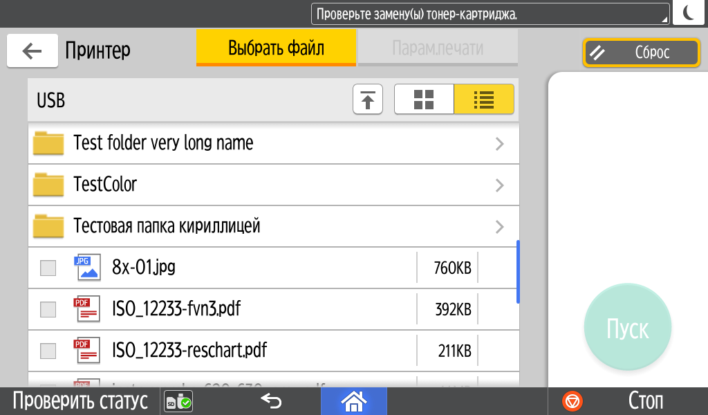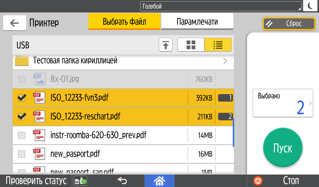 Для работы с USB-flash задавалось сохранение в виде многостраничного PDF-файла, время замерялось от нажатия кнопки «Пуск» до автовозврата в окно с содержимым носителя, при сканировании с компьютера (драйвер TWAIN) — от старта кнопкой приложения до появления последней страницы в его окне.