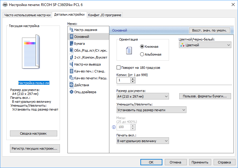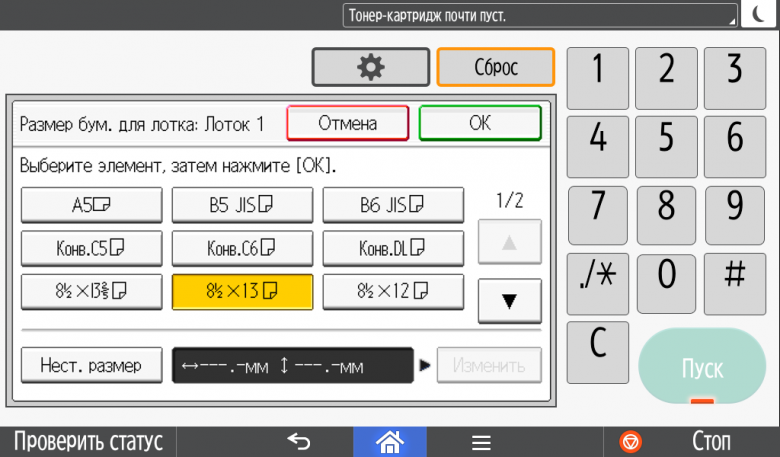 Задается размер оригинала — стандартными установками до А4 или прямым вводом длины и ширины. По умолчанию используется размер бумаги в выбранном лотке.