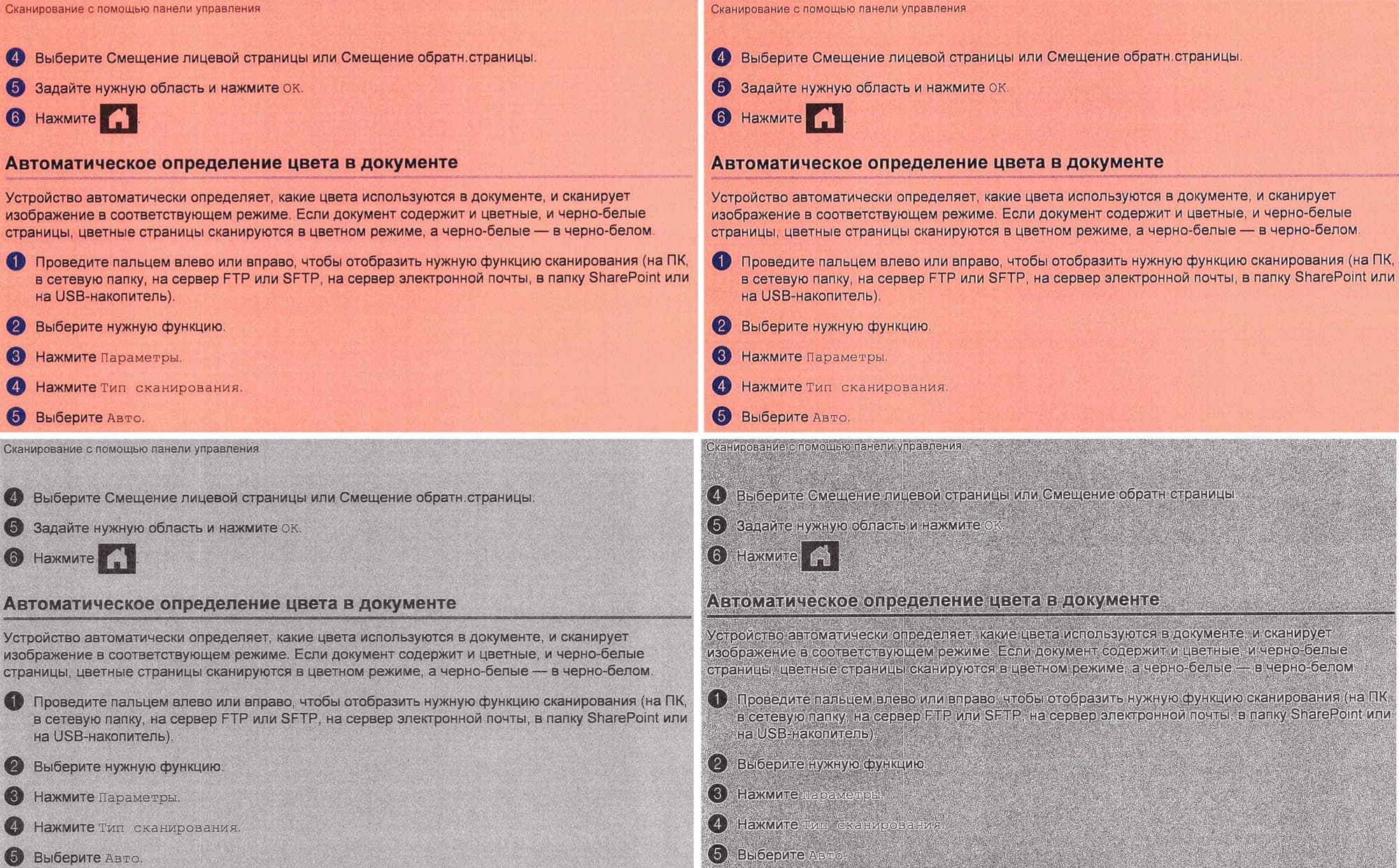 Мы опробовали осветление фона, сделав цветную и монохромную копии текста, напечатанного на бумаге розового цвета. Честно говоря, ожидали большего: интенсивность фонового цвета практически не изменилась, разве что на черно-белой копии он стал зернистым, а вокруг букв текста на обеих копиях появились светлые ореолы, которые в монохромном режиме сделали часть текста трудночитаемой.