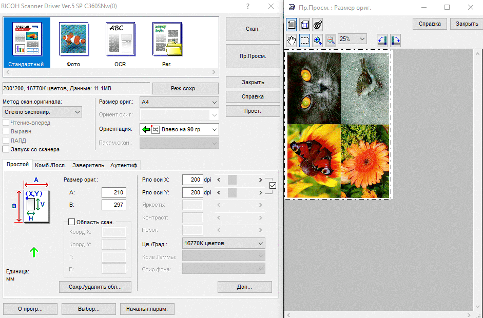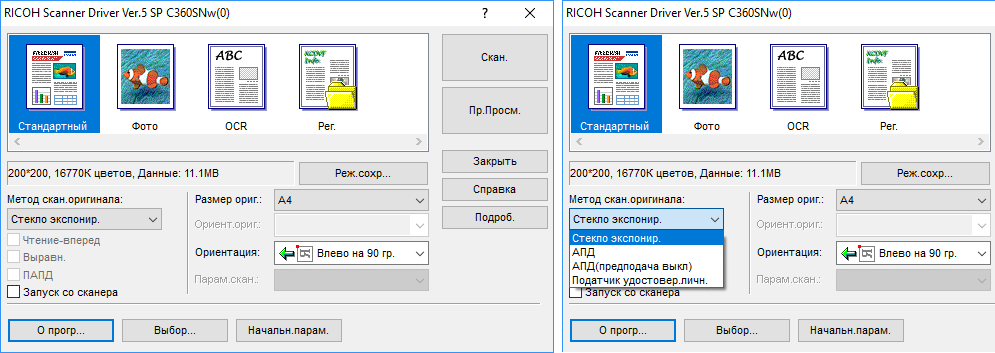 В знакомом нам МФУ Ricoh Aficio MP C305SPF за подобную «идеологию» отвечала установка предподачи в драйвере — ее включение существенно ускоряло сканирование с АПД: листы сканировались и обрабатывались практически непрерывно. В драйвере для Ricoh SP C360/361 также есть управление предподачей: можно выбирать между режимами «АПД» и «АПД(предподача выкл)»; в таблице приведено значение именно для включенной предподачи, а с выключенной время обработки пакета существенно увеличивается — в черно-белом режиме при 300 dpi практически втрое, до 6:22 мин.