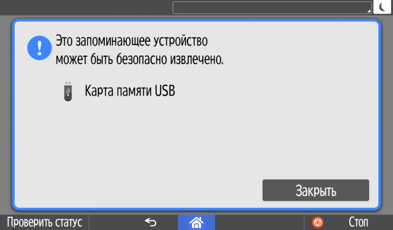 При установке накопителя в соответствующий порт или слот экран на несколько секунд отображает строчку с сообщением об этом, а в левой части нижней строчки появляется крошечная кнопочка с изображением флешки или SD-карты, нажатие на которую позволит извлечь носитель без опасения потерять данные. В инструкции она называется «Media Information», вот только никакой информации о носителе не выводится (правда, указание остатка свободного места в мегабайтах присутствует на экране сканирования на носитель).