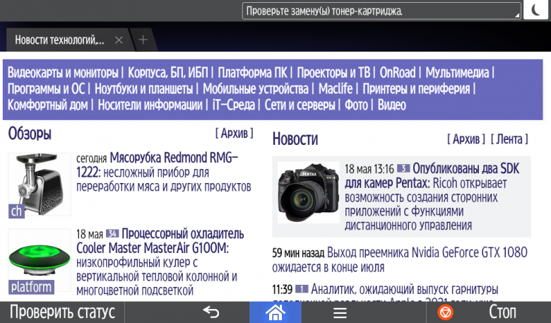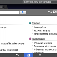 Надо отметить, что поверхность экрана, в отличие от имеющихся в очень многих других принтерах и МФУ, не глянцевая, а скорее матовая. Это уменьшает блики от источников света и отражение окружающих предметов (а также физиономии самого оператора), к тому же и отпечатки пальцев, которыми неизбежно и очень быстро покрывается сенсорный экран, не так заметны.