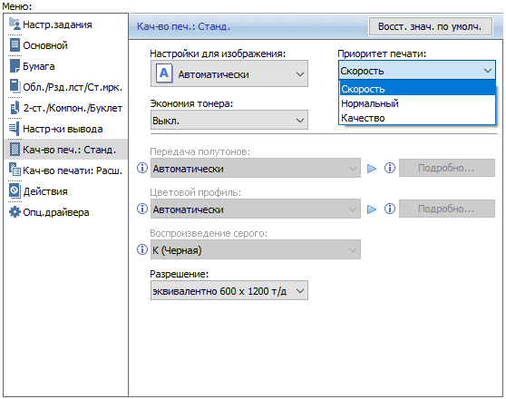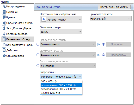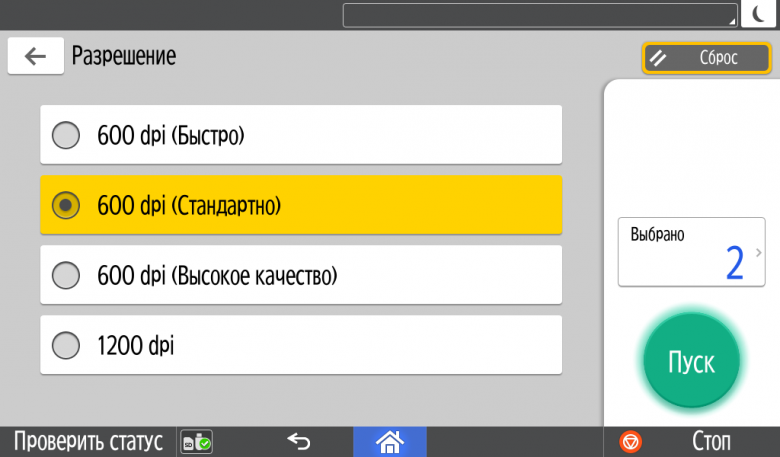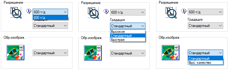 Набор настроек печати примерно тот же, что и для копирования. Появляется и выбор градаций разрешения печати, но в своеобразном виде: для файлов JPEG и TIFF их три, все на 600 dpi, а отличие в пометках «Быстро», «Стандартно», «Высокое качество». Для PDF добавляется четвертая, на 1200 dpi.