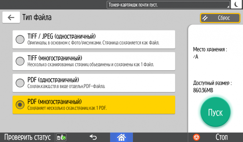 Первые этапы процедуры те же, что и для печати. Затем следует выбор места для сохранения файла (создание папки не предусмотрено, можно лишь использовать имеющиеся), при этом над экранной кнопкой «Пуск» отображается остаток свободного места на носителе.