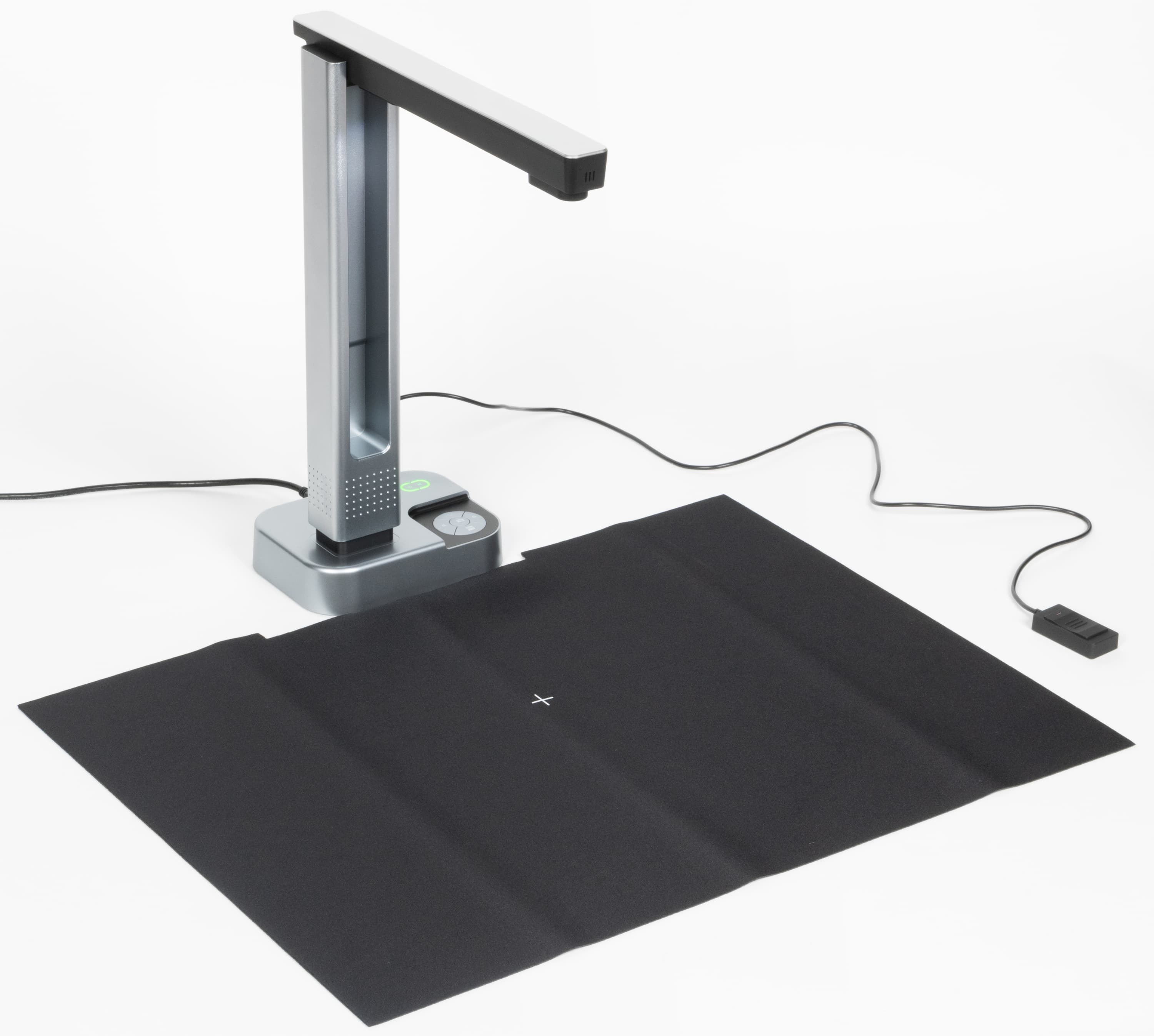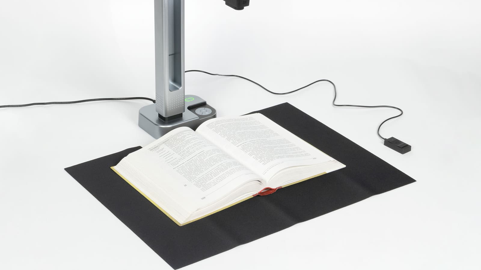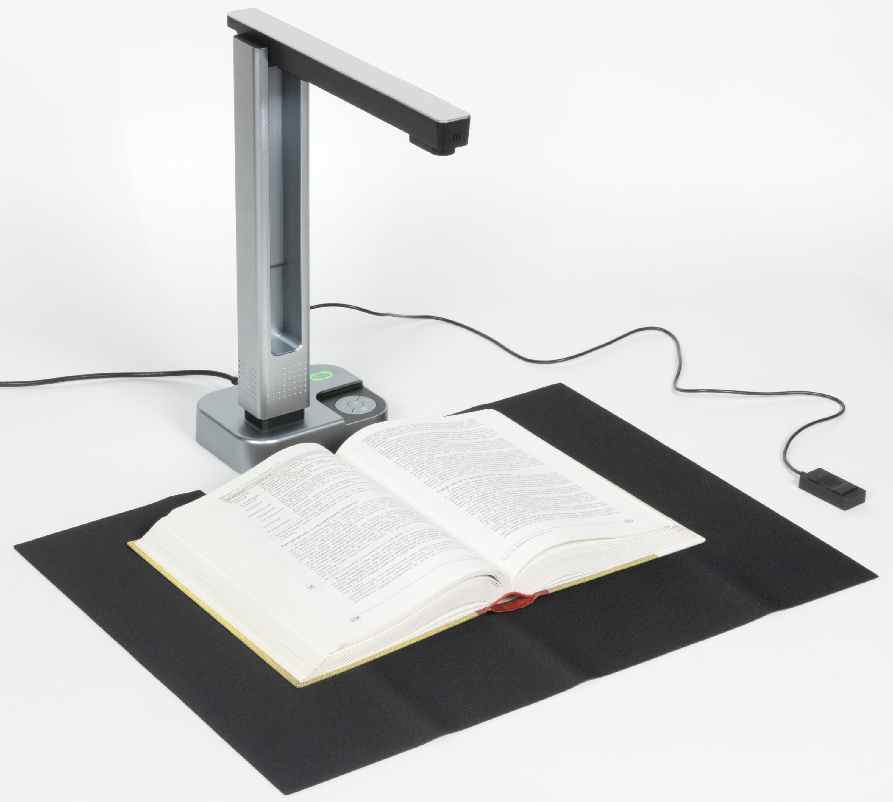 И тут на выручку приходят книжные сканеры, которые еще называют проекционными, планетарными, а порой и документ-сканерами (но мы такое название использовать не будем, чтобы не путать с протяжными). Эти аппараты больше всего похожи на настольную лампу: блок с оптикой на штативе размещается над оригиналом любого вида (лист, книга, подшивка) и размера (чаще всего до А3 включительно, что позволит работать с разворотом книг «энциклопедического» формата), при этом не нужно даже основания с соответствующими размерами — его вполне заменяет гибкий коврик, создающий фон (обычно черный) для последующей автоматической обработки.