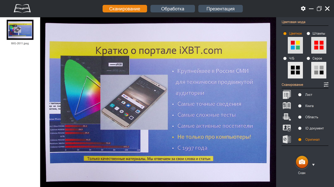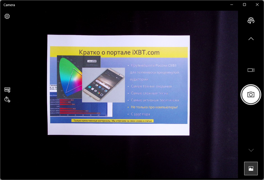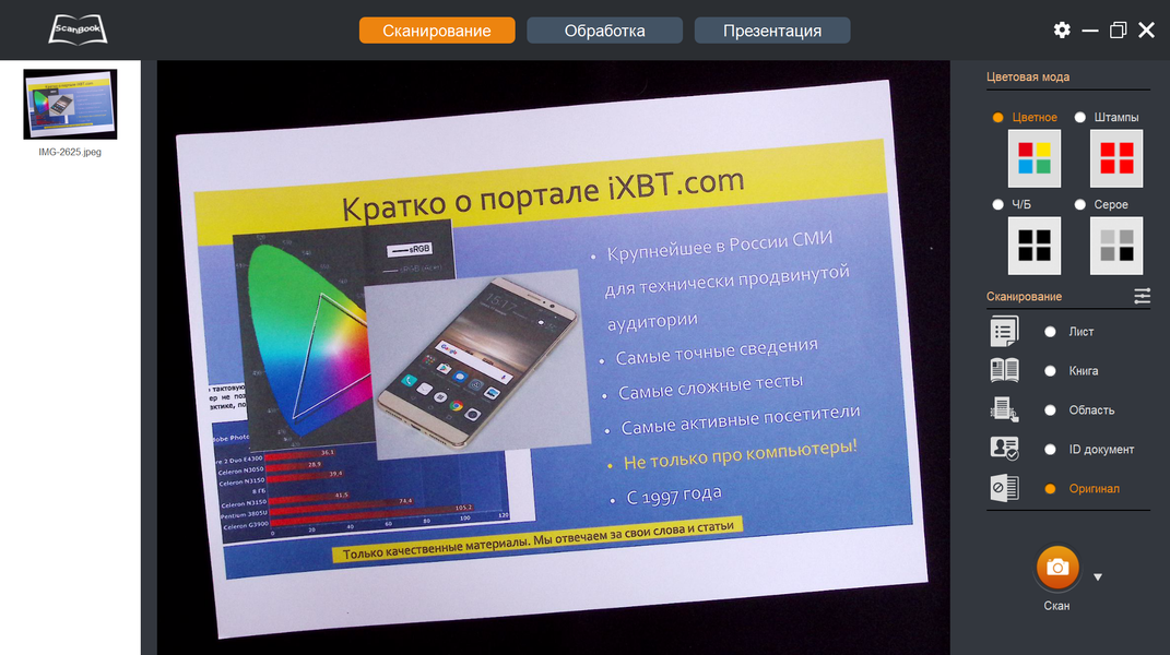 То есть во время презентаций не получится оперировать документами с размером, близким к А3, и это порой может стать критичным. Конечно, если речь про трансляцию изображения со сканера на какой-то внешний экран через компьютер, то не обязательно выбирать режим «Презентация» — можно показывать и из «Сканирования», а то и вообще из стандартной оснастки «Камера» Windows (см. выше), но при создании видеоролика такие оригиналы окажутся обрезанными по краям.