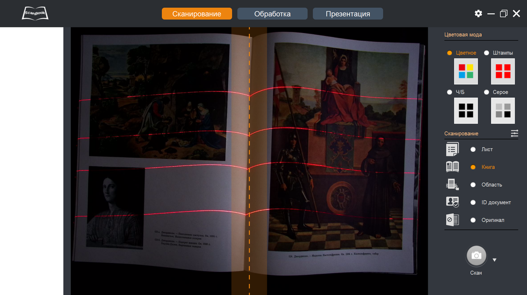 После нажатия кнопки «Скан» на короткое время заработают лазерные диоды: и на самом оригинале, и на его изображении в окне программы будут видны красные линии, это нужно для последующего автоматического устранения изгиба страниц.