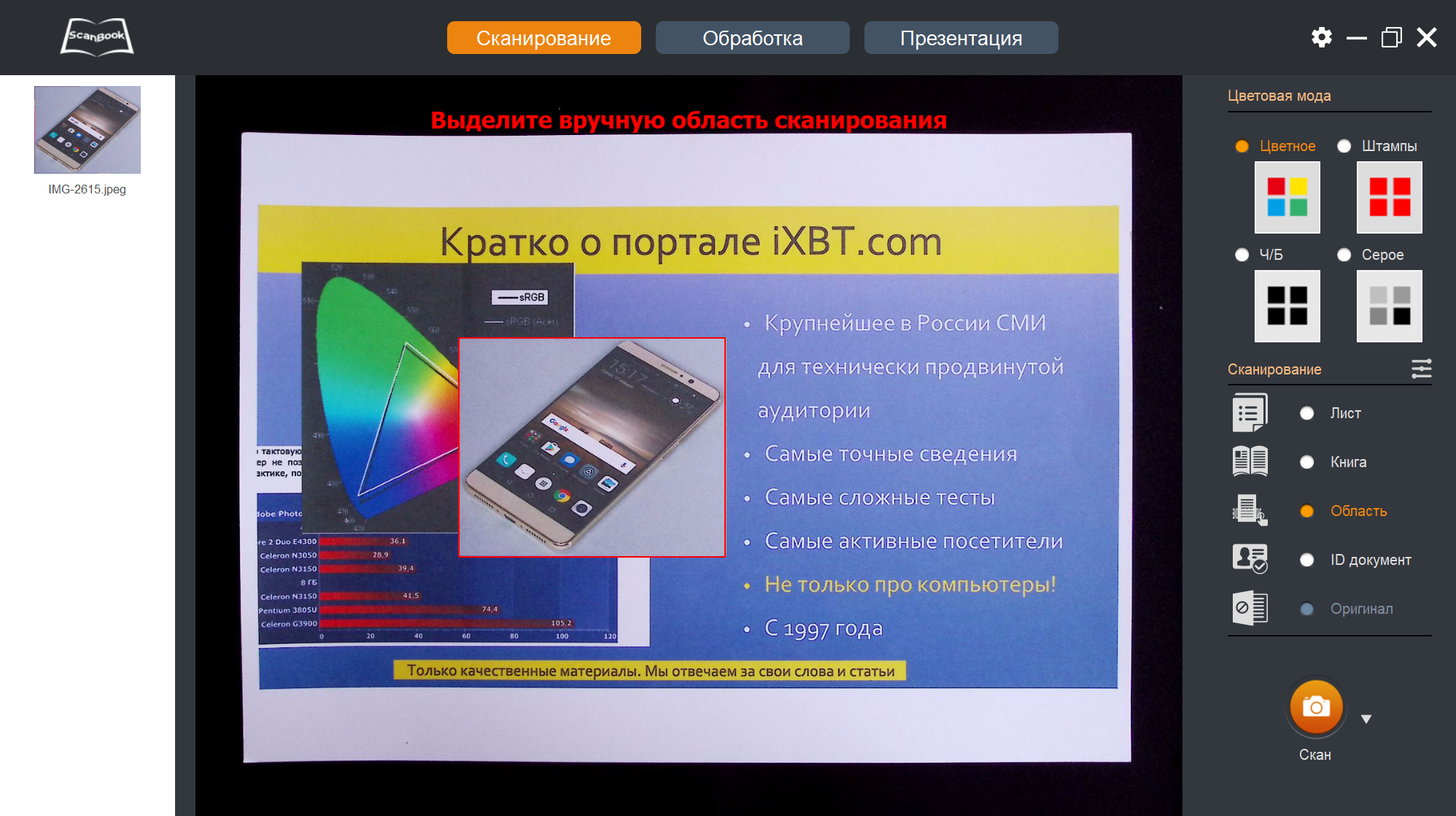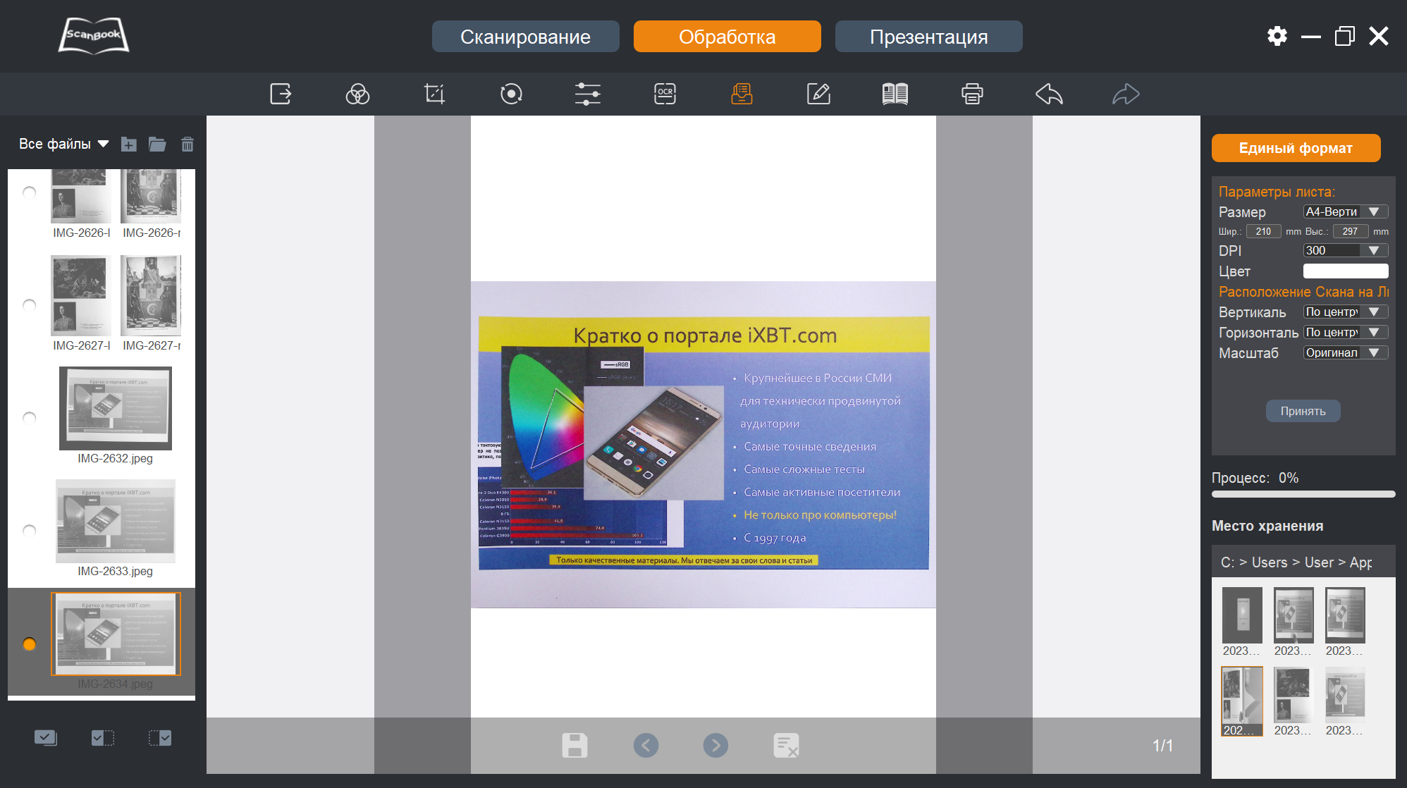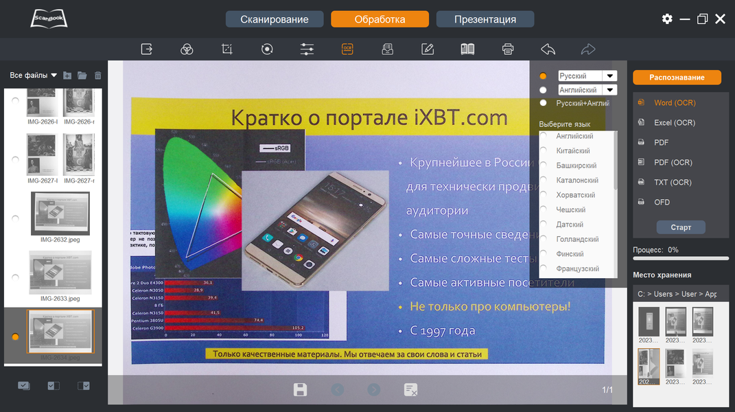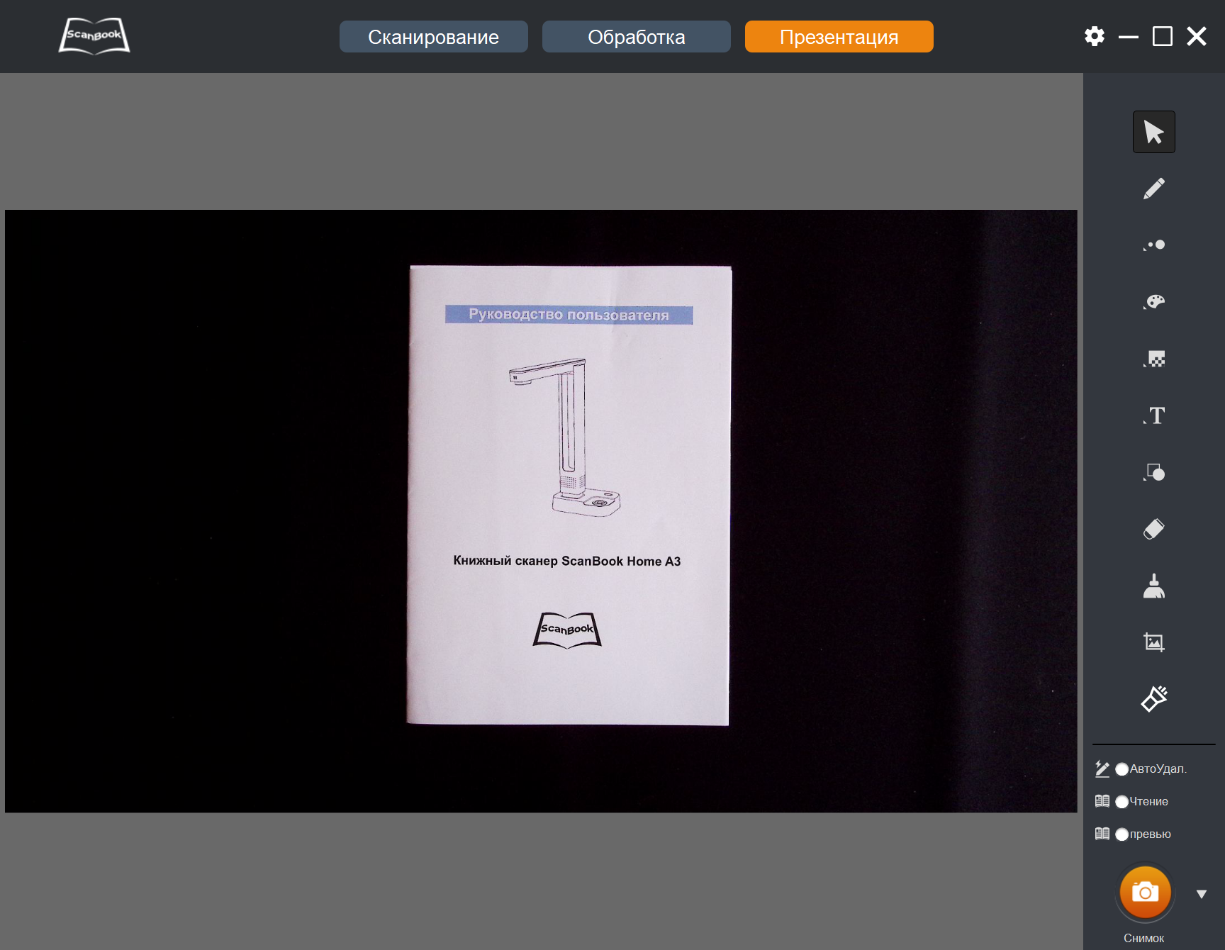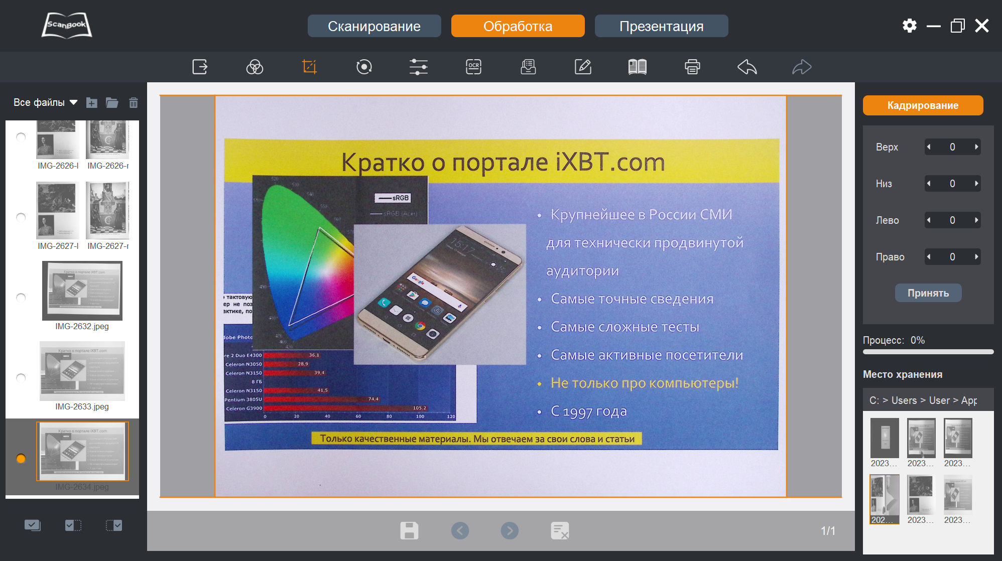Теперь, когда снимки-сканы получены, с ними можно что-то сделать — переходим к пункту «Обработка» в верхней строчке окна программы ScanBook.