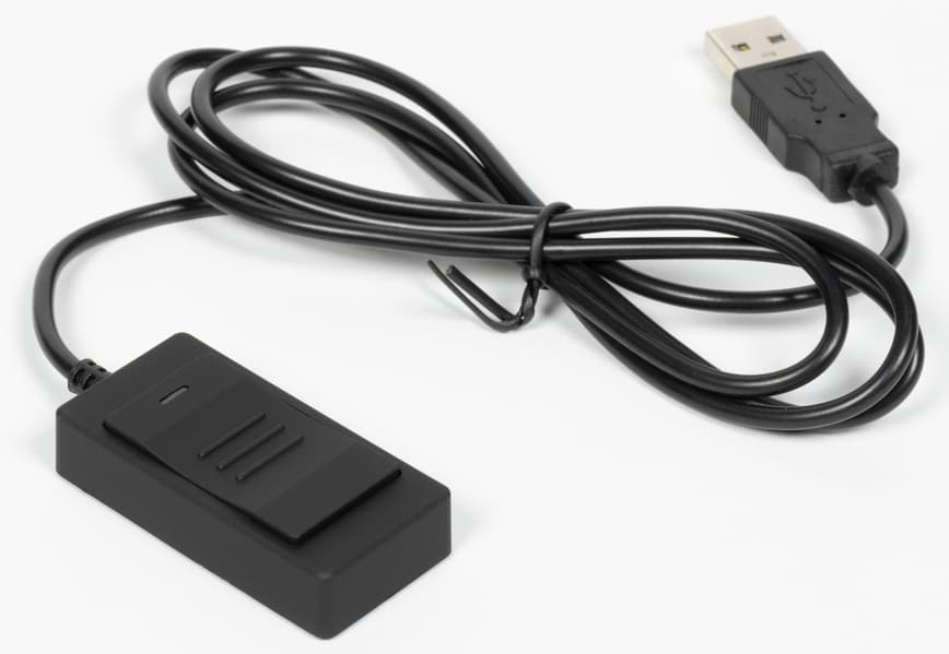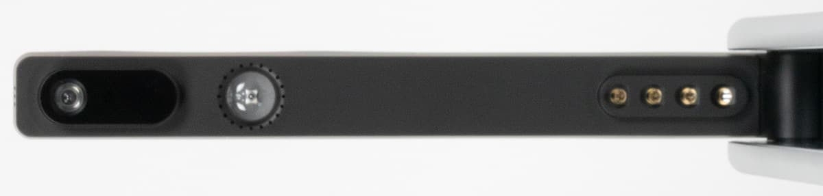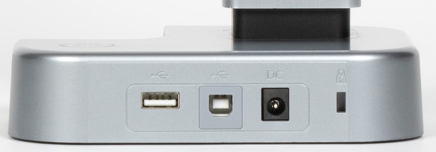 На заднем торце основания расположены разъемы: USB-A для подключения кнопки или педали, дублирующих центральную кнопку, USB-B для подключения к компьютеру, гнездо дополнительного питания и отверстие кенсингтонского замка.