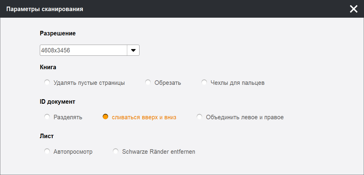 Для документов на отдельных листах можно задать автопросмотр — после нажатия «Скан» на 3-4 секунды будет появляться снимок, а еще есть функция, почему-то обозначенная на немецком языке: «Schwarze Ränder entfernen», что в переводе означает удаление черных краев (установлено по умолчанию).