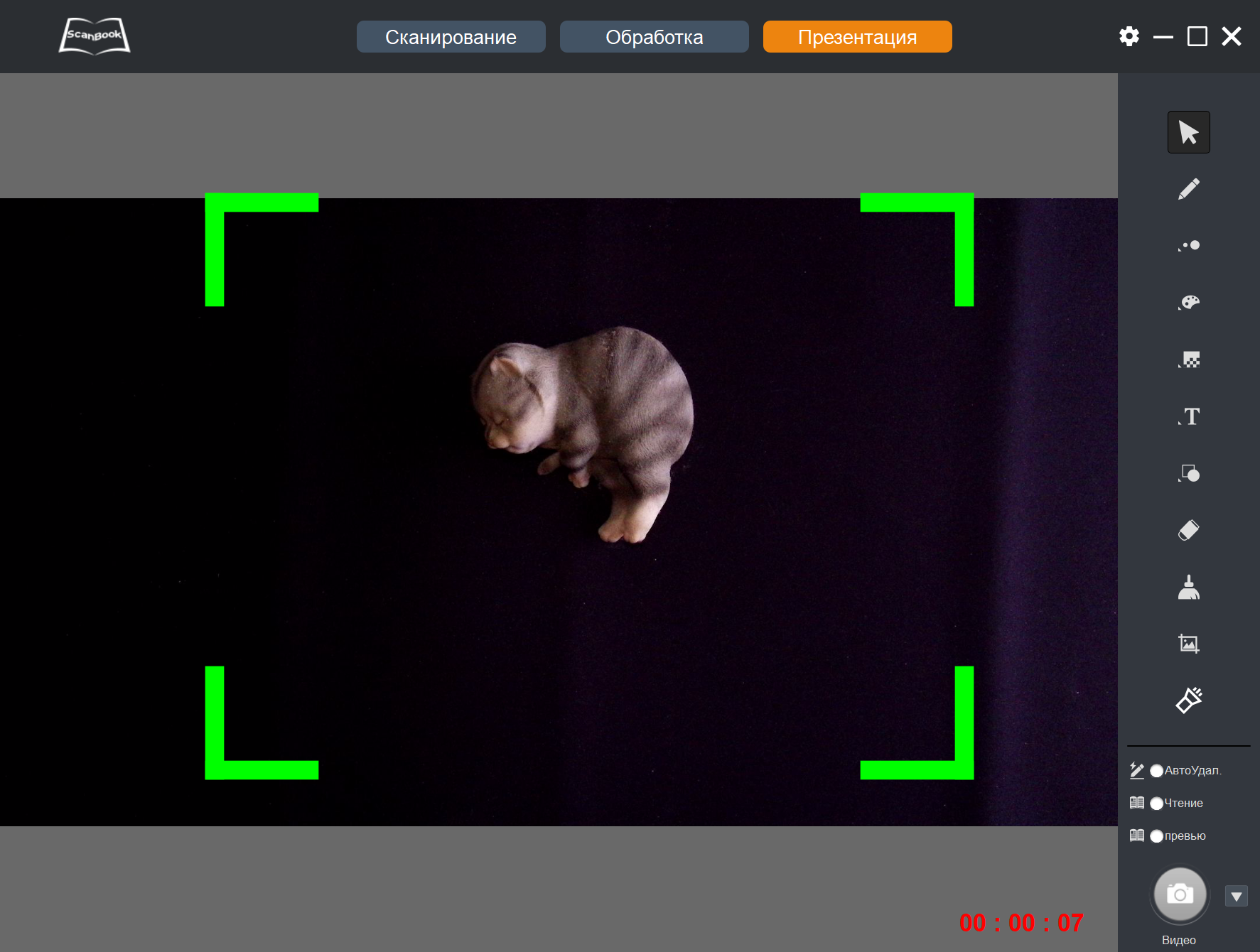 Но надо понимать, что фигуры или текст накладываются на транслируемое с камеры изображение — работать можно вообще без какого-то исходного документа, рисуя на черном фоне коврика или на белом, если положить чистый лист. Каким-то образом изменять попадающее в объектив изображение (документ или иной объект) в режиме презентации нельзя.