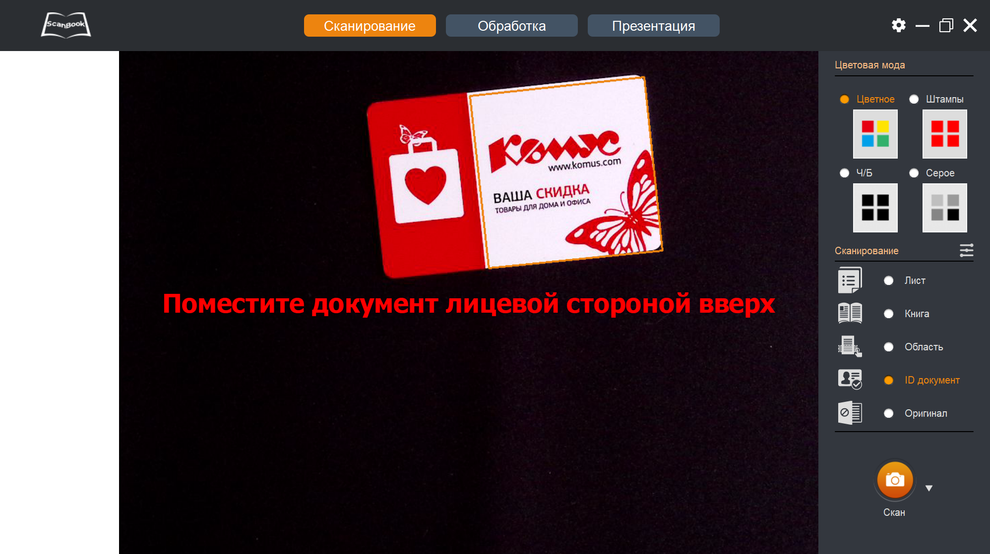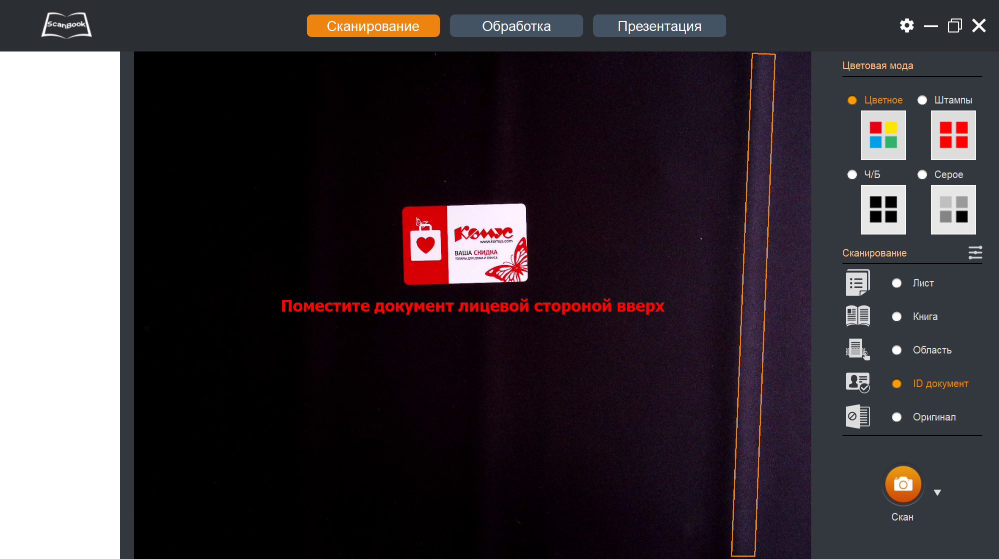 Наконец, с установкой «ID документ» можно обрабатывать ID-карты — небольшие оригиналы с двусторонним расположением текста или изображений, а также многостраничные документы вроде паспортов. Сначала появляется предложение поместить документ лицевой стороной вверх; по идее, на черном коврике должна определяться внешняя граница оригинала, как это мы видели для «Лист», но такое происходит не всегда — вот пример с дисконтной картой: