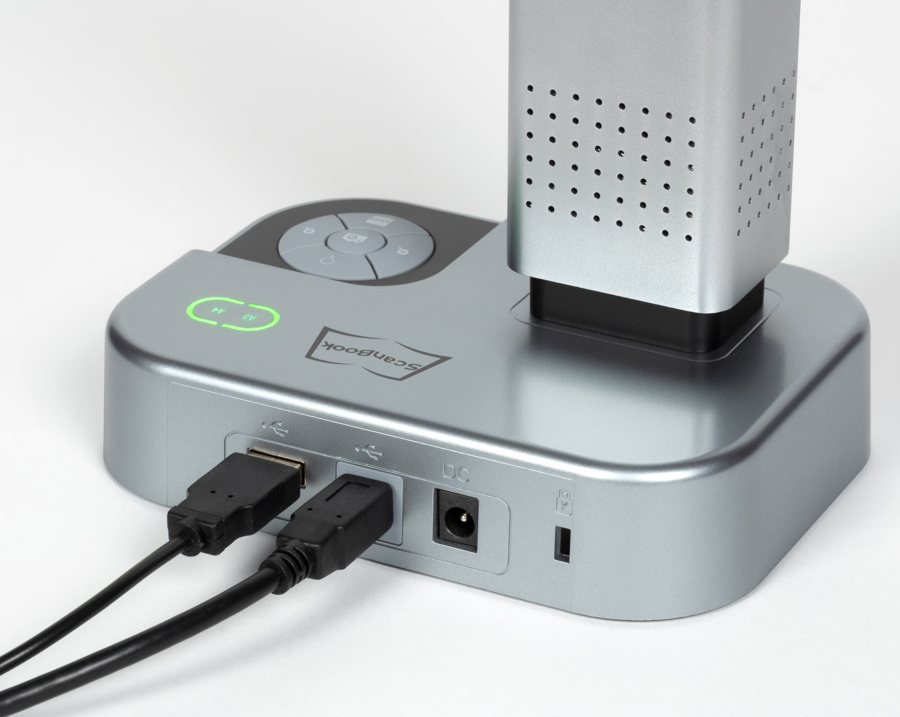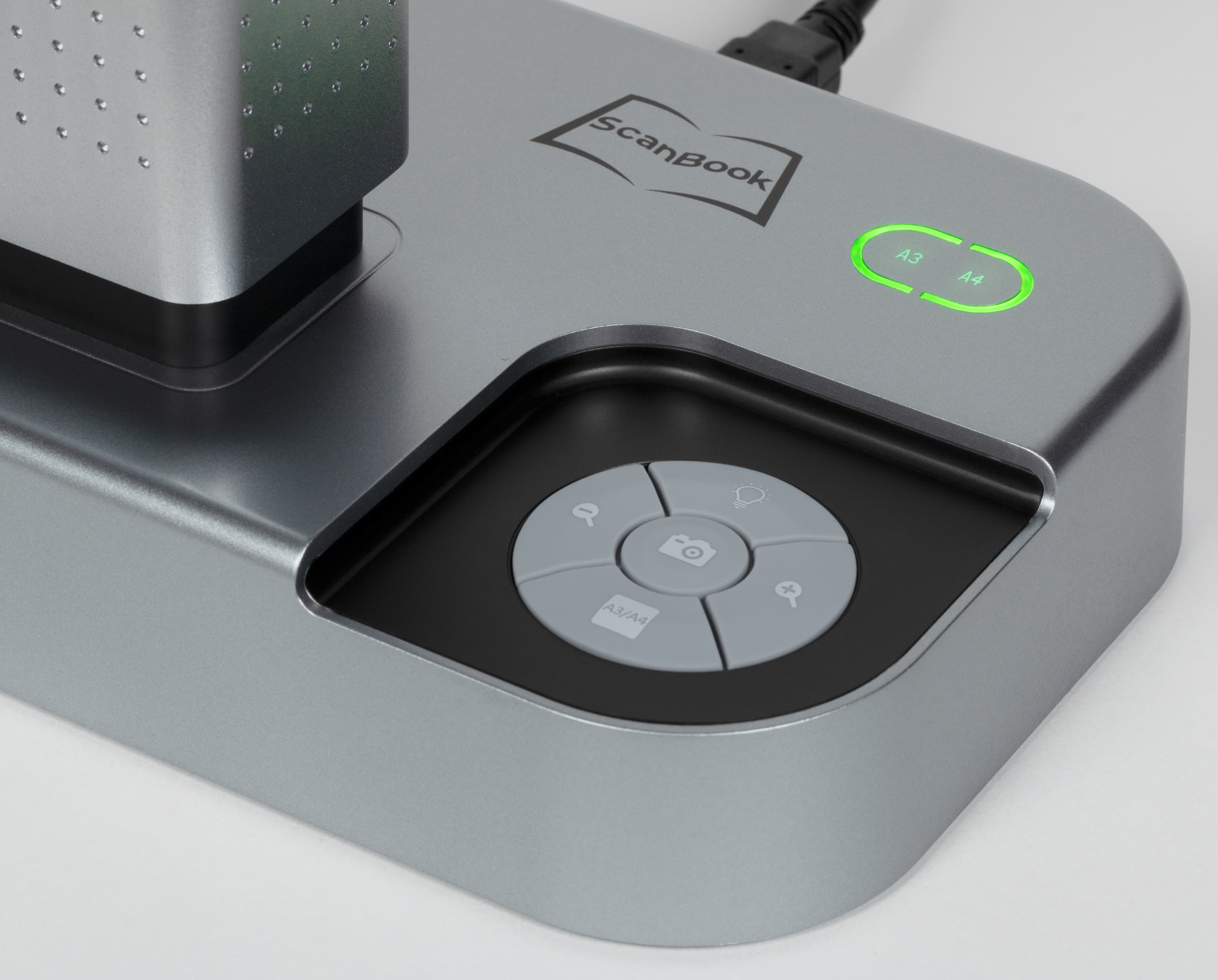 Основой панели управления является кольцевая группа из пяти кнопок. Их назначение не указано в инструкции, но вполне понятно по нанесенным символам: нажатие центральной делает снимок (скан), две боковые управляют увеличением-уменьшением, дальняя включает подсветку и выбирает один из трех уровней яркости, ближняя переключает формат А3/А4, который отображается на расположенном за группой кнопок индикаторе.