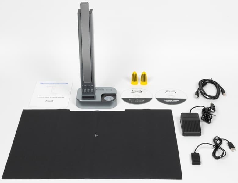 Помимо самого аппарата, в коробке находятся кабель USB 2.0 длиной 1,45 м для подключения к компьютеру, мягкий коврик 52,5×39,5 см черного цвета, устройства дистанционного пуска — педаль размером 100×61×33 мм (звонко щелкает при нажатии) с кабелем 1,95 м и кнопка 50×24×12 мм с кабелем 1,0 м, два силиконовых колпачка для пальцев, весьма лаконичная инструкция с описанием органов сканера на русском языке и два компакт-диска с ПО — для Windows и Linux.