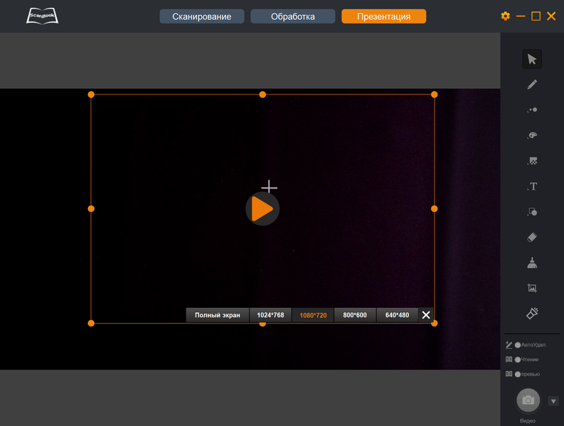Теперь как записать ролик: выбираем для кнопки в правом нижнем углу функцию «Видео», нажимаем эту кнопку — запись сразу не начнется, сначала надо задать формат кадра. Делать это можно как выбором фиксированных значений, так и перетаскиванием границ оранжевой рамки вручную (саму рамку тоже можно перемещать). Если выбрать «Полный экран», в кадр попадет и значительная часть окна программы.